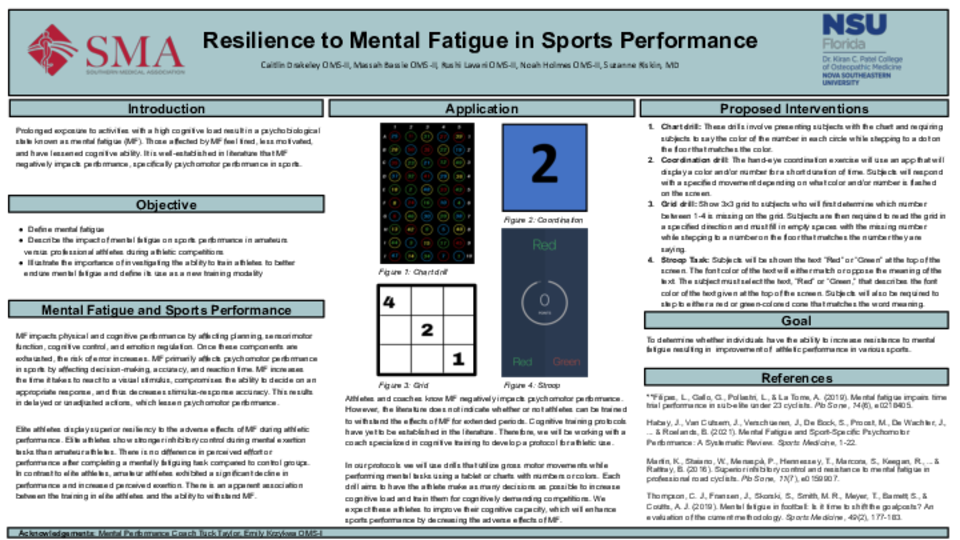 Our goal is to create interventions to assist with decision-making, working memory, planning, response inhibition, coordination, rhythm, and reaction times. The drills utilize gross motor movements while performing mental tasks using a tablet or charts with numbers or colors. Each drill aims to have the athlete make as many decisions as possible to increase cognitive load and train them for cognitively demanding competitions. We expect these athletes to improve their cognitive capacity, which will enhance sports performance by decreasing the adverse effects of MF.