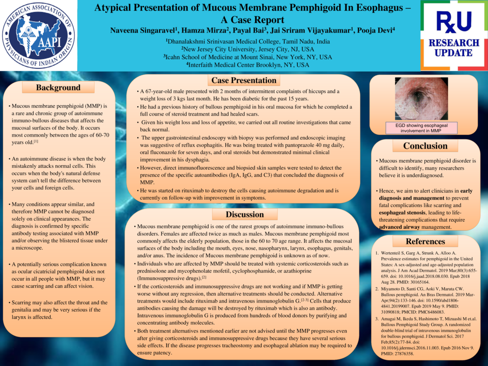 Conclusion: Mucous membrane pemphigoid disorder is difficult to identify, many researchers believe it is underdiagnosed. Hence, we aim to alert clinicians in early diagnosis and management to prevent fatal complications like scarring and esophageal stenosis, leading to life-threatening complications that require advanced airway management.