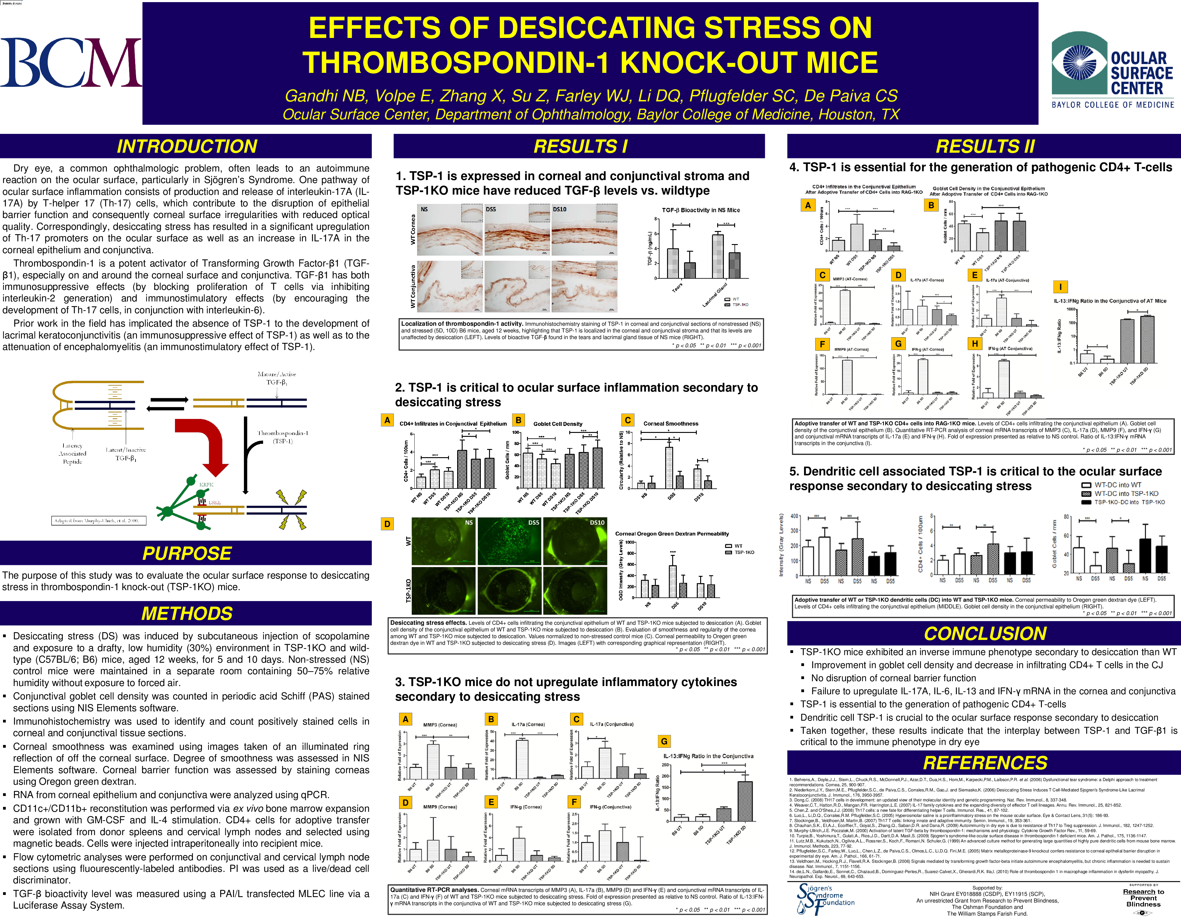 Thrombospondin-1 (TSP-1) is a physiologic activator of TGF-beta, a critical induction factor for Th-17 mediated immunity. The purpose of this study was to investigate the role of TSP-1 in the induction of the Th-17 ocular surface response to desiccating stress (DS). TSP-1 knock-out (KO) and wild-type (WT) mice were subjected to DS for 5 or 10 days (DS5, DS10) and parameters of ocular surface disease including corneal barrier function, conjunctival CD4+ T cell infiltration and goblet cell (GC) density were evaluated. Desiccation increased expression of TSP-1 in conjunctival antigen presenting cells (APCs). TSP-1KO mice subjected to DS had less corneal barrier disruption, reduced loss of PAS+ GC, and decreased CD4+ T cell infiltration in the conjunctiva. In contrast to WT, TSP-1KO mice failed to upregulate MMP-3 and MMP-9 mRNA transcripts in the cornea and IL-17A mRNA transcripts in the conjunctiva. RAG-1KO recipients of adoptively transferred CD4+ T cells isolated from TSP-1KO mice subjected to DS for 5 days showed milder dry eye phenotype and less conjunctival inflammation than recipients of CD4+ T cells from DS5 WT control. Reconstitution of TSP-1KO mice with WT-APCs prior to DS reversed the resistance of the TSP-1KO to DS-induced immunopathology. In conclusion, APC-derived TSP-1 is critical for generating the Th-17 ocular surface response to DS.