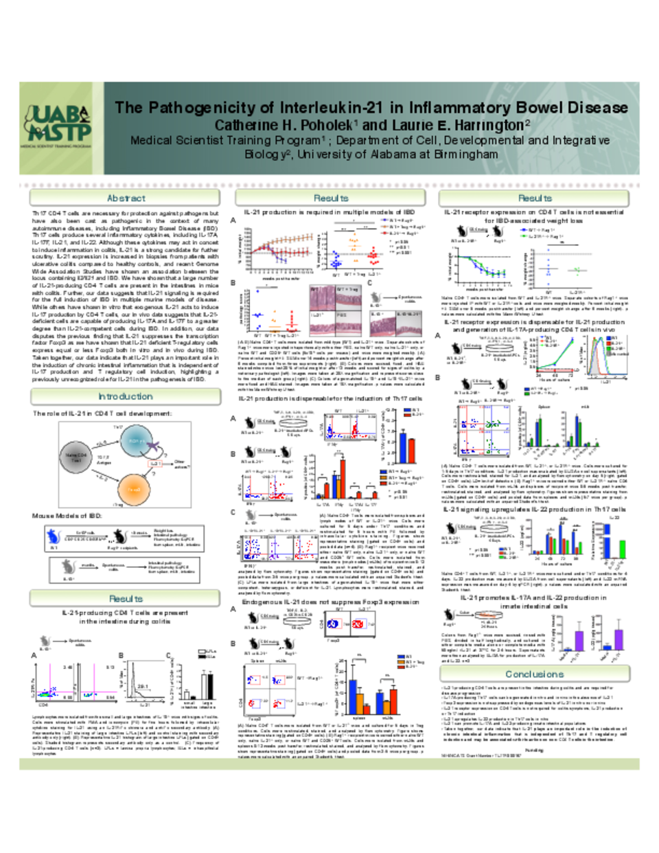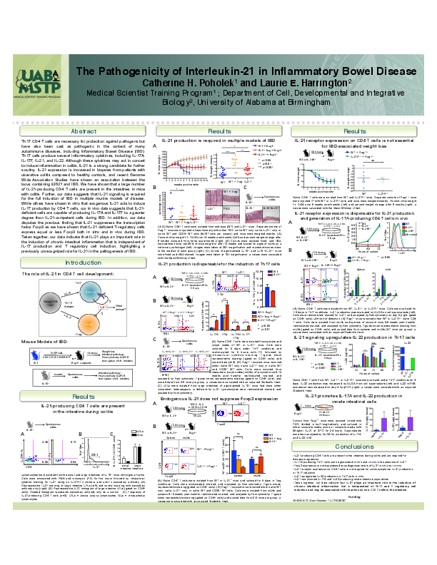 Th17 CD4 T cells are necessary for protection against pathogens but have also been cast as pathogenic in the context of many autoimmune diseases, including Inflammatory Bowel Disease (IBD). Th17 cells produce several inflammatory cytokines, including IL-17A, IL-17F, IL-21, and IL-22. Although these cytokines may act in concert to induce inflammation in colitis, IL-21 is a strong candidate for further scrutiny. IL-21 expression is increased in biopsies from patients with ulcerative colitis compared to healthy controls, and recent Genome Wide Association Studies have shown an association between the locus containing il2/il21 and IBD. We have shown that a large number of IL-21-producing CD4 T cells are present in the intestines in mice with colitis. Further, our data suggests that IL-21 signaling is required for the full induction of IBD in multiple murine models of disease. While others have shown in vitro that exogenous IL-21 acts to induce IL-17 production by CD4 T cells, our in vivo data suggests that IL-21-deficient cells are capable of producing IL-17A and IL-17F to a greater degree than IL-21-competent cells during IBD. In addition, our data disputes the previous finding that IL-21 suppresses the transcription factor Foxp3 as we have shown that IL-21 deficient T-regulatory cells express equal or less Foxp3 both in vitro and in vivo during IBD. Taken together, our data indicate that IL-21 plays an important role in the induction of chronic intestinal inflammation that is independent of IL-17 production and T regulatory cell induction, highlighting a previously unrecognized role for IL-21 in the pathogenesis of IBD.