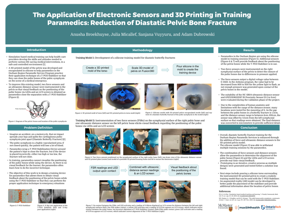 Simulation-based medical training can help paramedics develop the skills and attitudes needed to perform various life-saving medical interventions, such as the application of a T-POD Stabilizer to a patient with a diastatic butterfly fracture of the pubic symphysis. The pubic symphysis is a cartilaginous joint between the left and right pubic bones and consists of a fibrocartilaginous disc between them. A diastatic butterfly fracture occurs when the pubic symphysis splits apart, often during high-impact motor-vehicle accidents. As the pubic symphysis is a highly vascularized area, the patient will lose a substantial amount of blood if the fracture is not closed quickly. To close the pubic symphysis, paramedics wrap a T-POD Stabilizer around the patient's hips, but if the device is placed too high or too low relative to the hips, the separated pubic bones will not close. In training, it is difficult for paramedics to visualize the positioning of the pubic bones and know if they have correctly placed the stabilizer around the hips. As there is no visual feedback regarding the positioning of the pubic bones during training, paramedics often learn the incorrect application technique. Thus, the objective of this work is to design a training device that allows paramedics to obtain visual feedback about the positioning of the pelvic bones while using the T-POD Stabilizer so that they can perform the correct application technique in emergency scenarios. Initially, a 3D-printed model of the pelvis was developed and encapsulated in silicone to enhance the Durham Region Paramedic Training Program. The model was further refined by the addition of two force sensors and one ultrasonic distance sensor to provide information regarding the alignment and distance between the pubic bones while the T-POD Stabilizer is used in training. The ultrasonic distance sensor was attached to a vertical 3D-printed mount on the left pubic bone and the two force sensors were attached to the symphysial surface on the right pubis. An LCD screen displayed the distance between the symphysial surfaces, and a set of three LEDs provided visual feedback of the positioning of the pubic bones. If there is no contact between the force sensors and the left symphysial surface, a red LED will flash, but if one force sensor contacts the left symphysial surface, a yellow LED will flash to indicate that realignment of the T-POD Stabilizer is needed. When both force sensors contact the symphysial surface, a green LED will flash, indicating perfect alignment and placement of the stabilizer. Overall, this new model will further enhance paramedic's training of diastatic butterfly fractures of the pubic symphysis.