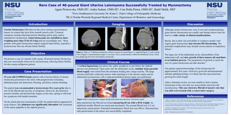 Case Description: A 35-year-old G1P0010 female patient with a known history of uterine leiomyoma presented to the clinic with progressively worsening abdominal pain and distension, bloating, and heavy uterine bleeding. The patient was seen by a gynecologist five years prior and was recommended a hysterectomy due to size of the fibroid and severity of symptoms. However, she declined at the time, opting to treat her fibroids with herbal remedies instead. Since the last gynecological evaluation, the symptoms had worsened, which prompted her to visit the emergency department. On the initial physical examination, the patient appeared in no acute distress. Her abdomen was significantly distended with extension of the uterus palpable at the xiphoid process. Right periumbilical hernia was noted. BMI was 33.7. CT abdomen and pelvis without contrast demonstrated a large 35 cm mass with a central density within the abdominal cavity, which was displacing the bowel and kidneys posteriorly. Gynecology was consulted. Patient denied inpatient surgery and opted for the outpatient evaluation with interval treatment for iron deficiency anemia due to menorrhagia. After review of CT scan and patient’s desire for future fertility, a myomectomy with possible hysterectomy was scheduled. A vertical laparotomy just above the pubic symphysis to just below the xiphoid process was performed. Upon entry into the abdominal cavity, large parasitic blood supply was noted from the omentum feeding into a large myoma. The myoma had a relatively narrow stalk attaching it to the uterine corpus and an abdominal myomectomy with a right periumbilical hernia repair was performed. Intra- operatively the fibroid was found to measure 60 cm and weight 40 lb. An additional 2-3 cm, sub- serosal, posterior fibroid was noted and enucleated. Estimated intraoperative blood loss was 300cc. Myomectomy with preservation of the uterus was successfully completed.