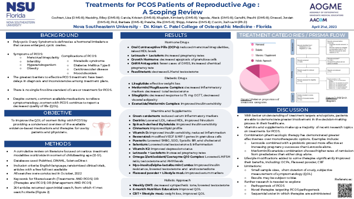 Polycystic ovary syndrome (PCOS) is a condition characterized by increased production of androgens, insulin resistance, and infertility. The barriers to effective treatment of PCOS have been identified as inconsistencies in treatment plans among physicians and delays in diagnosis. The objective of this review is to improve the QOL of women living with PCOS by providing a condensed overview of the currently available evidence-based medications and therapies and spreading awareness of their existence. Using the electronic databases PubMed, CINAHL, and ScienceDirect, a scoping review was conducted on the globally available treatments for PCOS. Our population of interest is women of reproductive age (12-51), clinically diagnosed with PCOS. The literature on the available treatments for PCOS revealed a wide range of therapeutics with statistically significant evidence of reduction of symptoms and/or improvement in fertility status and pathological processes such as: insulin resistance, hormone imbalance, obesity, inflammation, and infertility. Dozens of treatment options for PCOS have been identified, including new medications and modifications to existing treatment regimens. With a better understanding of their options, women with PCOS can become more involved in the decision-making process to improve their health.