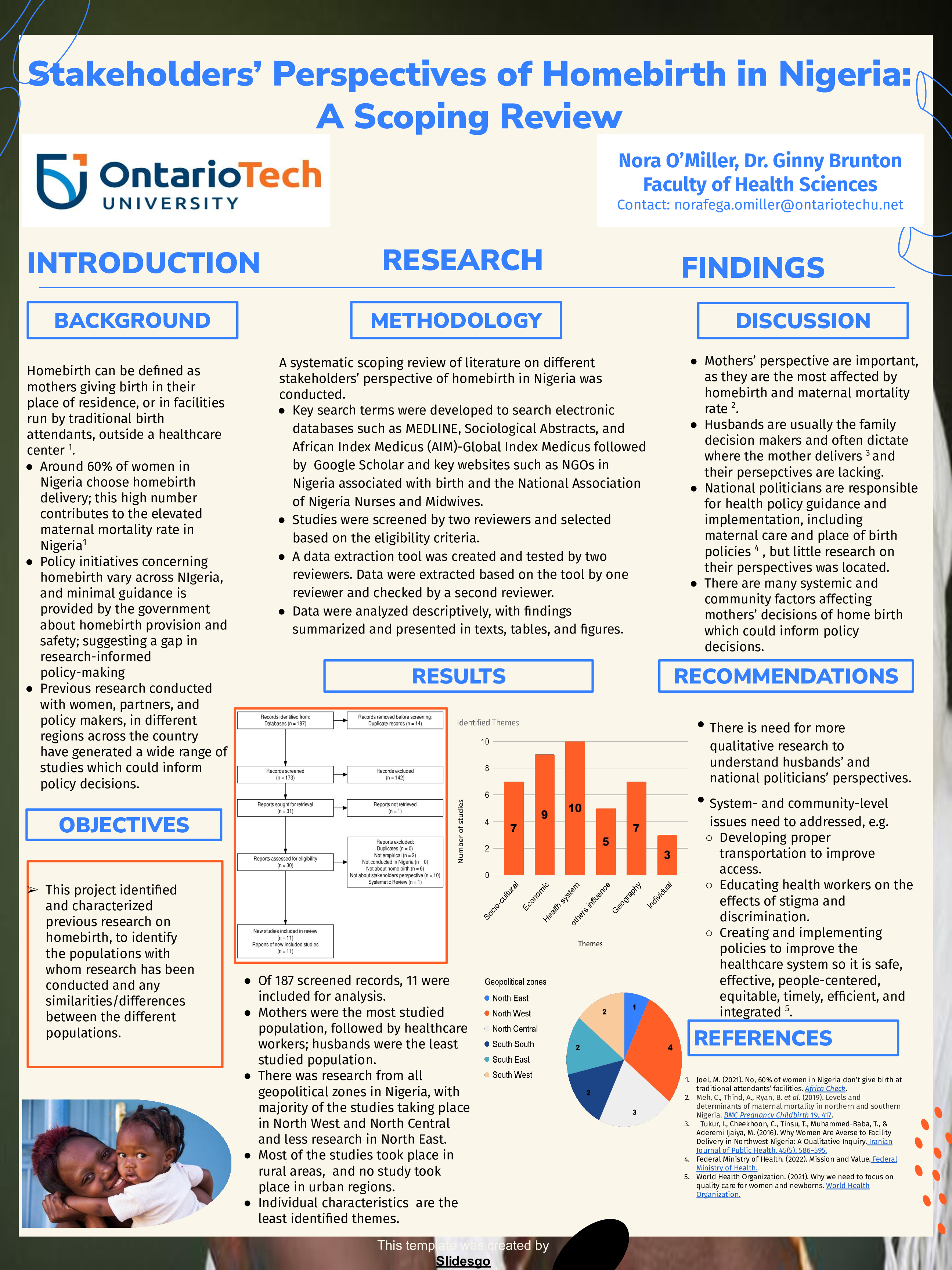 Introduction: Homebirth is defined as a mother giving birth in her residence, outside a health care center. It also includes women delivering at a facility run by traditional birth attendants (TBAs). Many women in developing countries like Nigeria, deliver at home, assisted by TBAs who are often unskilled 1. About 60% of women in Nigeria choose to deliver at home. This is a substantial proportion of home birth and it contributes to the increased mortality in Nigeria 1. Minimal guidance is provided by the Nigerian government concerning home birth provision and safety, and policy initiatives vary across the country; portraying a gap in research synthesis. Previous research has generated a wide range of studies concerning different stakeholders’ perspectives of home birth in Nigeria, conducted on different populations, e.g.women, partners, and policymakers, and in different regions across the country. This research aimed to identify and characterize previous research in home birth which enabled us identify the populations on whom research has been conducted and the similarities and differences between the different populations. We conducted a systematic scoping review of the literature on different stakeholders’ perspectives of home birth in Nigeria.