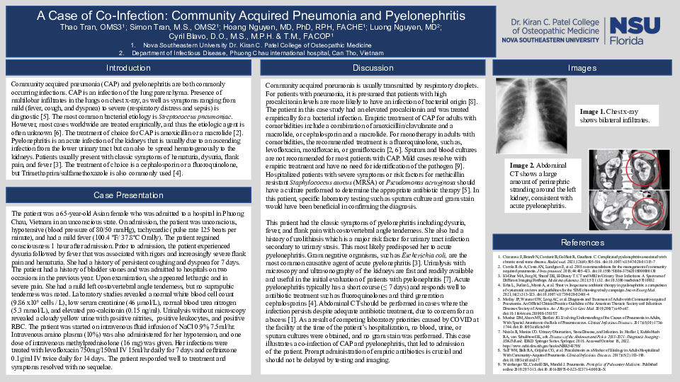 Discussion: This case illustrates a co-infection of CAP and pyelonephritis, that led to admission of the patient. Prompt administration of empiric antibiotics is crucial and should not be delayed by imaging.