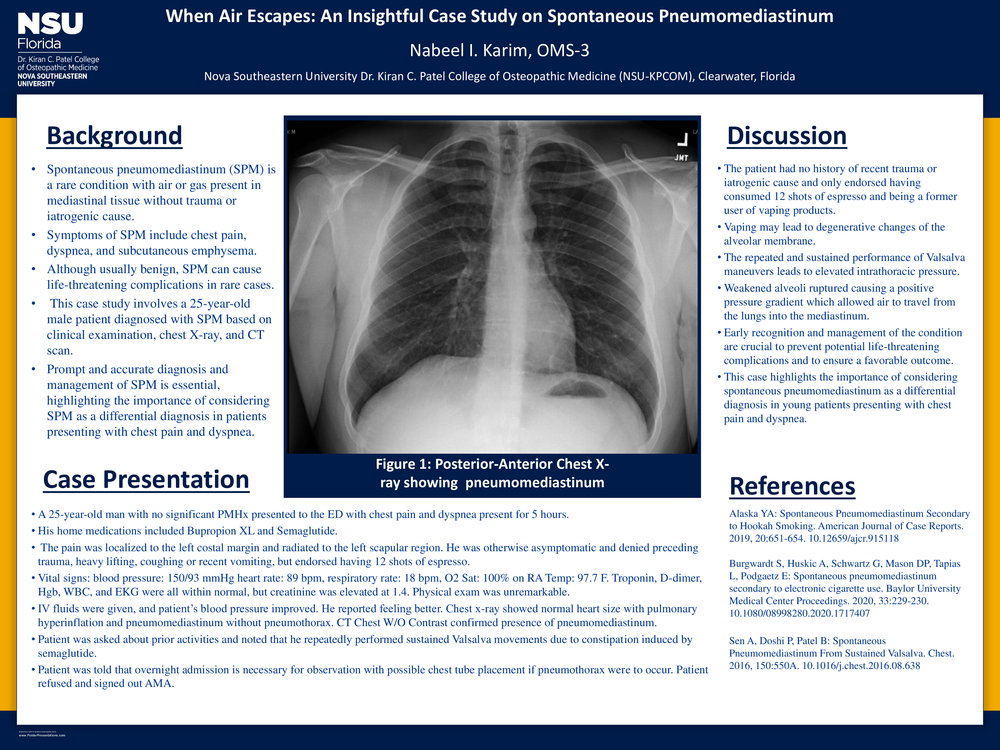 Case: A 25-year-old man presented to the emergency department with chest pain and dyspnea present for 5 hours. It was localized to the left costal margin and radiated to the left scapular region. He was otherwise asymptomatic and denied preceding trauma, heavy lifting, coughing or recent vomiting, but endorsed having 12 shots of espresso. He had no significant medical history, was a prior vape user on Bupropion Xl and Ozempic. His vital signs were: blood pressure 150/93 mmHg, heart rate 89 bpm, respiratory rate 18 bpm, oxygen saturations on room air 100% and temperature 97.7 F. Examination was also unremarkable. Troponin, d-dimer, Hgb, WBC, and EKG were all within normal, but creatinine was elevated. IV fluids were given and the patient’s blood pressure improved and reported feeling better. Chest x-ray showed normal heart size with pulmonary hyperinflation and pneumomediastinum without pneumothorax. CT Chest W/O Contrast confirmed presence of pneumomediastinum. Patient was asked about prior activities and noted being extremely constipated and repeatedly performed sustained Valsalva movements. The patient was told that overnight admission is necessary for observation with possible chest tube placement if pneumothorax were to occur. Patient refused, signed out AMA, and was advised to follow up with repeat Chest X-ray after one week or to return if condition worsens.