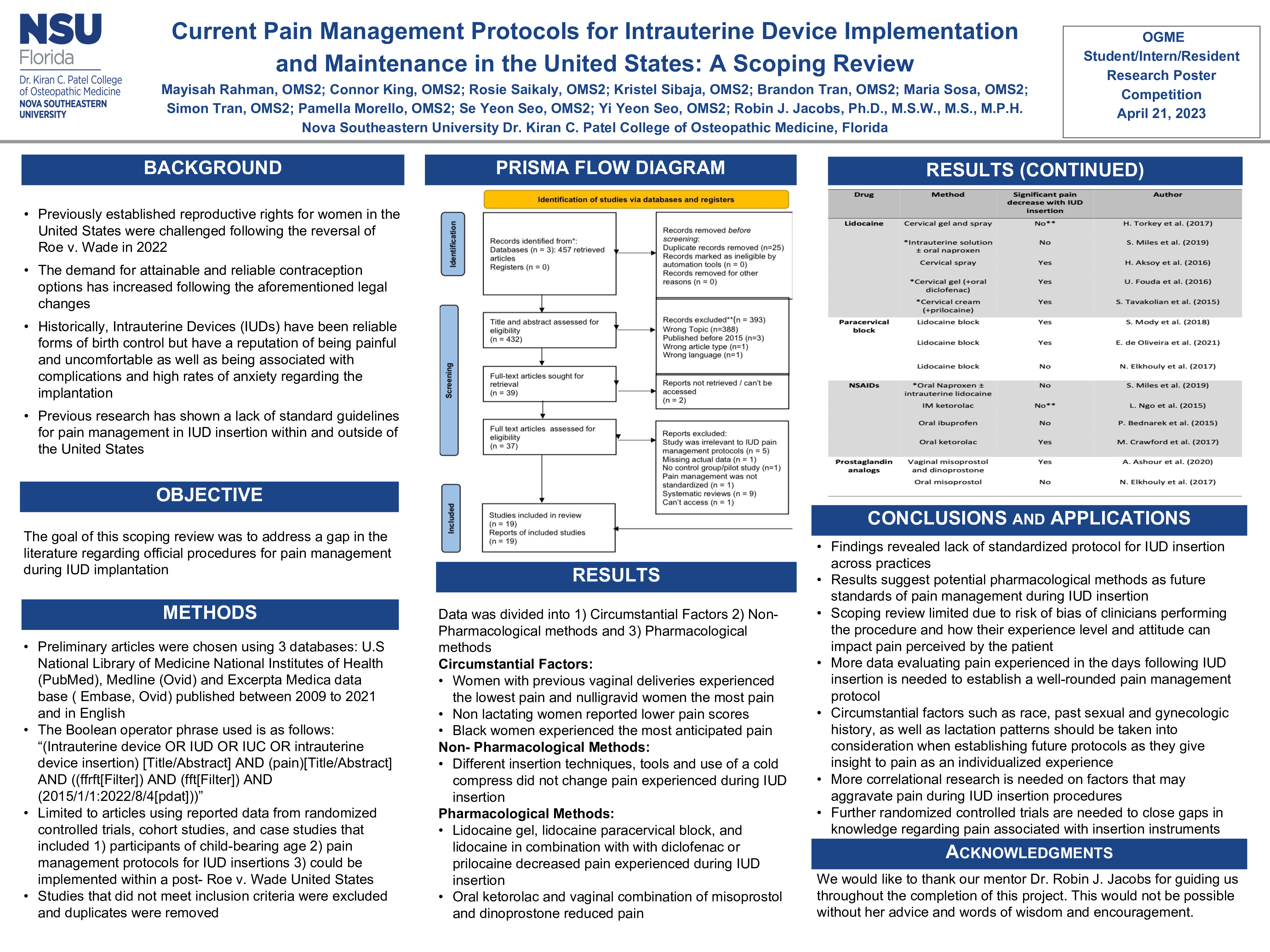Conclusion: Findings from this scoping review revealed a lack of uniformity across practices when conducting IUD insertions. The findings within the themes may be a large factor contributing to the lack of standardized care. More research is needed regarding the intricacy of pain with IUD insertion. Moving forward, especially following a potential increase in the use of IUDs following the reversal of Roe v. Wade, establishing this gap may lead to a more refined standardized protocol to minimize pain with IUD insertions.