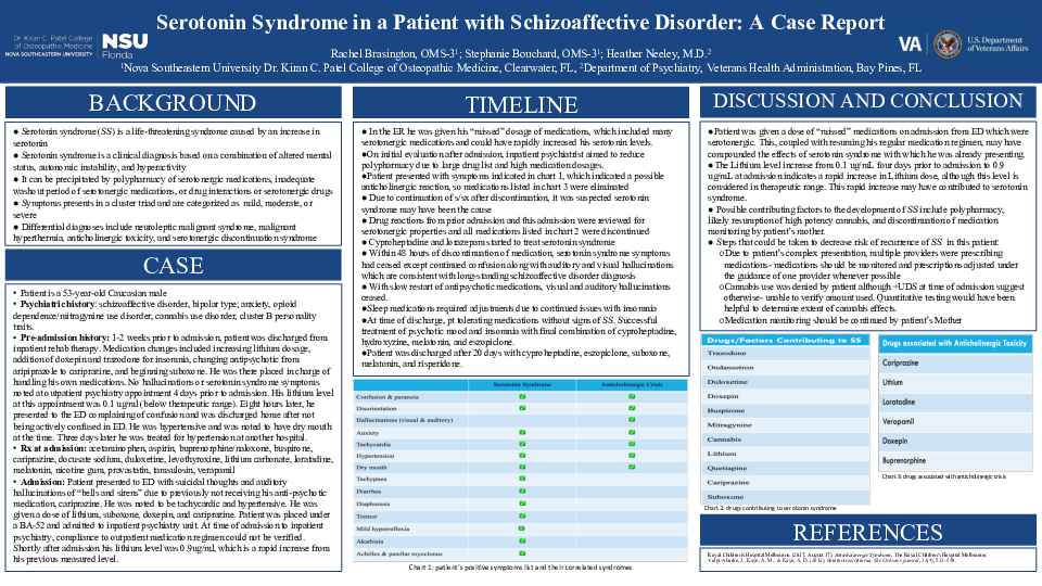 Introduction: Serotonin Syndrome is a possibly life-threatening syndrome caused by an increase in serotonin levels in the body. The prevalence of serotonin syndrome is largely unknown due to the wide array of symptoms and the lack of confirmatory testing. Diagnosis must be made clinically based on a combination of altered mental status, autonomic instability, and hyperactivity. Most cases of serotonin syndrome are precipitated by polypharmacy of serotonergic medications. The list of medications that could play a role is extensive. Diagnosis is made increasingly difficult by the overlapping differential diagnoses such as neuroleptic malignant syndrome, malignant hyperthermia, and anticholinergic toxicity.