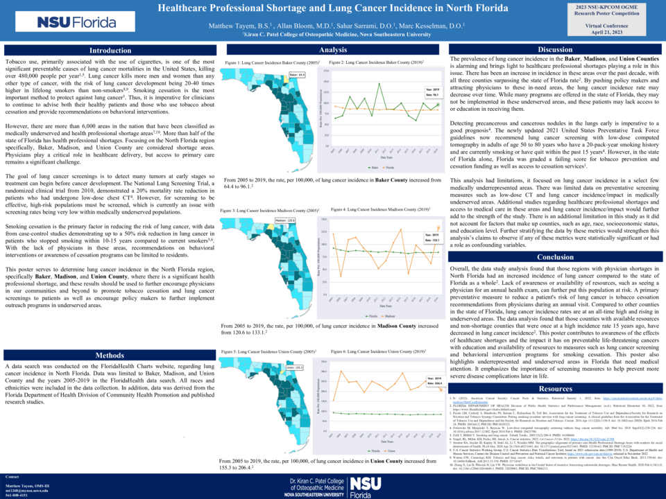 Conclusion: The prevalence of lung cancer incidence in the Baker, Madison, and Union Counties is alarming and brings light to healthcare professional shortages playing a role in this issue. Overall, the data study analysis found that those regions with physician shortages in North Florida had an increased incidence of lung cancer compared to the state of Florida as a whole. Compared to other counties in the state of Florida, lung cancer incidence rates are at an all-time high and rising in underserved areas. The data analysis showed that those counties with available resources and non-shortage counties that were once at a high incidence rate 15 years ago, have decreased in lung cancer. This poster contributes to awareness of the effects of healthcare shortages and the impact it has on preventable life-threatening cancers with education and availability of resources to measures such as lung cancer screening and behavioral intervention programs for smoking cessation. This poster also highlights underrepresented and underserved areas in Florida that need medical attention. It emphasizes the importance of screening measures to help prevent more severe disease complications later in life.