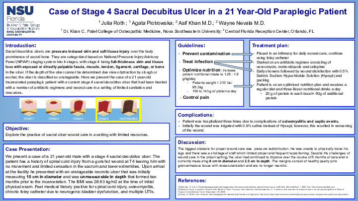 Introduction: Sacral decubitus ulcers are pressure-induced skin and soft tissue injuries over the body prominence of the sacral bone. They are categorized based on National Pressure Injury Advisory Panel (NPIAP) staging system into 4 stages, with stage 4 being full-thickness skin and tissue loss with exposed or directly palpable fascia, muscle, tendon, ligament, cartilage, or bone in the ulcer. If the depth of the ulcer cannot be determined due to obstruction by slough or eschar, the ulcer is classified as unstageable. Here we present the case of a 21-year-old incarcerated paraplegic patient with a current stage 4 sacral decubitus ulcer that had been treated with several antibiotic regimens and wound care in a setting of limited sanitation and resources.