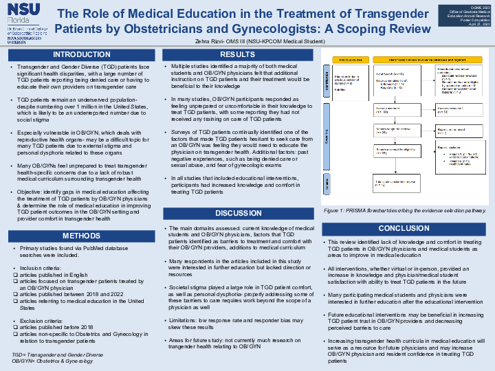 Transgender and Gender Diverse (TGD) patients face significant health disparities and remain an underserved population, especially in Obstetrics and Gynecology. Additionally, many Obstetricians and Gynecologists (OB/GYNs) may feel unprepared to treat transgender health-specific concerns due to a lack of robust medical curriculum. This study was designed as a scoping review to identify areas of improvement in medical education affecting treatment of TGD patients by OB/GYNs. The search was restricted to include articles in English, focused on TGD patients treated by an OB/GYN, and on medical education in the United States. The main domains assessed were surveys of current knowledge of medical students and OB/GYNs, factors that TGD patients identified as barriers to treatment and comfort with OB/GYNs, and medical curriculum. In many studies, OB/GYN participants responded as feeling unprepared or uncomfortable in their knowledge to treat TGD patients, with some reporting they had not received any training on care of TGD patients. Additionally, surveys of TGD patients identified that they were hesitant to seek care from an OB/GYN because they worried they would need to educate the physician on transgender health. In all studies that included educational interventions, participants had increased knowledge and comfort in treating TGD patients. In conclusion, this review identified lack of knowledge and comfort in treating TGD patients in OB/GYN physicians and medical students as areas to improve in medical education. All interventions, whether virtual or in-person, provided an increase in knowledge, and many participating medical students and physicians were interested in further education. Future educational interventions may be beneficial in increasing TGD patient trust in OB/GYN providers and decreasing perceived barriers to care.