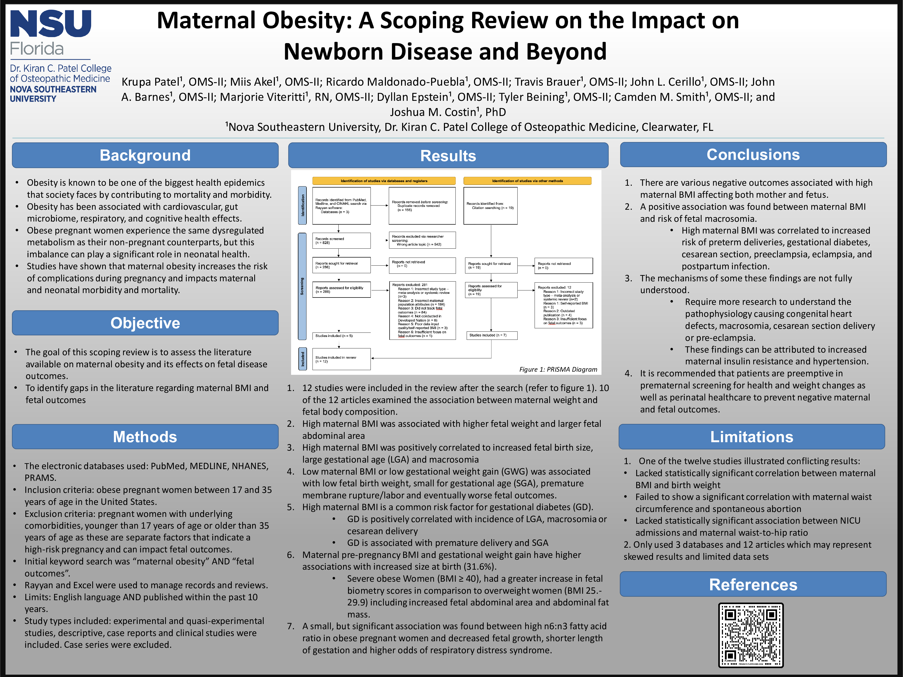 Methods: This scoping review used PubMed, MEDLINE, NHANES, and PRAMS databases. The search string used was “maternal obesity AND fetal weight OR apgar score OR fetal heart health OR fetal head circumference”. All reviewers screened the same 828 publications, in which twelve articles were finalized. The studies were grouped by fetal outcomes, analyzed and summarized in a table format by the type of outcomes, populations and study design, along with broad findings.