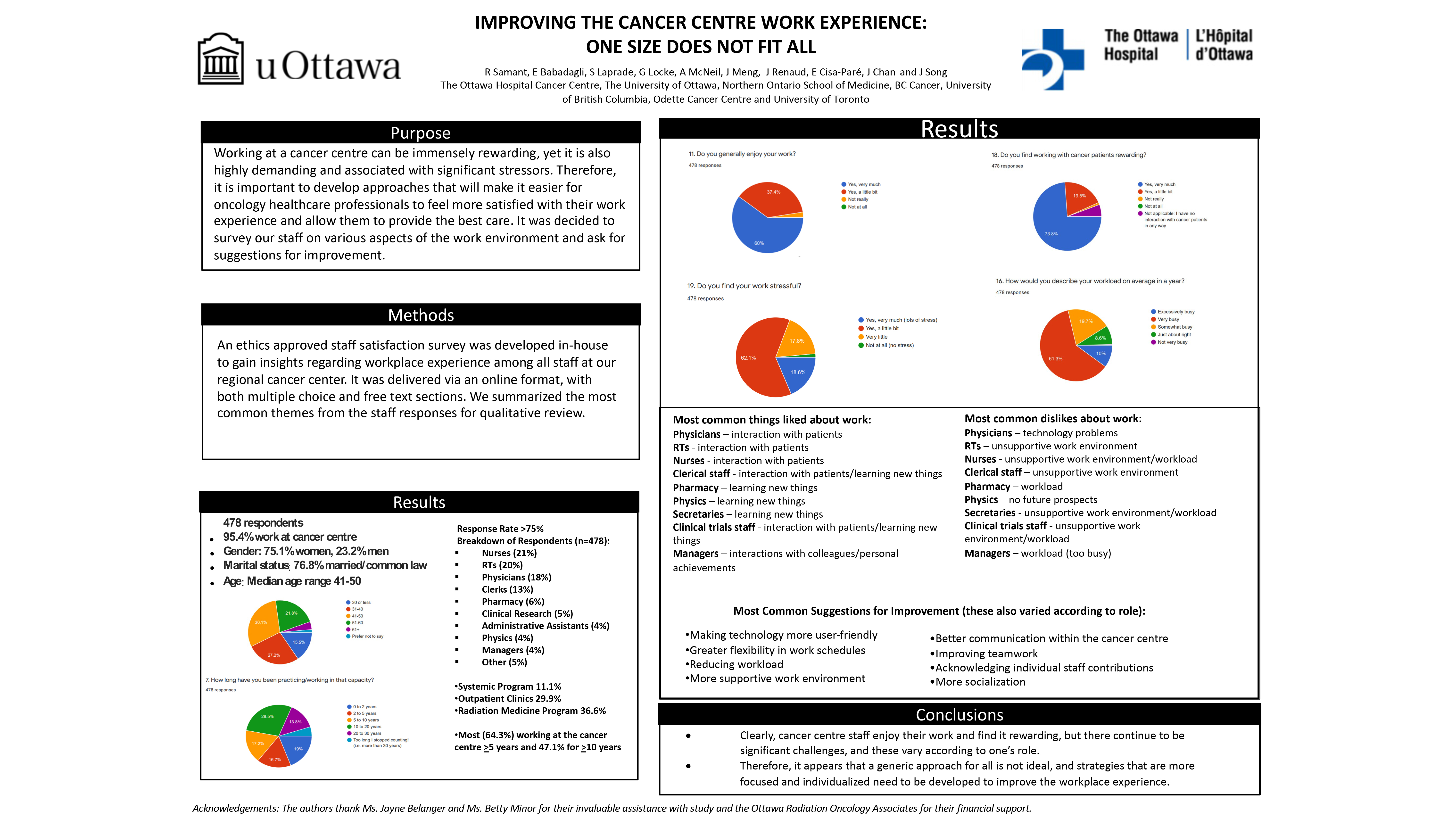 Methods: An ethics approved staff satisfaction survey was developed in-house to gain insights regarding workplace experience among all staff at our regional cancer center. It was delivered via an online format, with both multiple choice and free text sections. We summarized the most common themes from the staff responses for qualitative review.