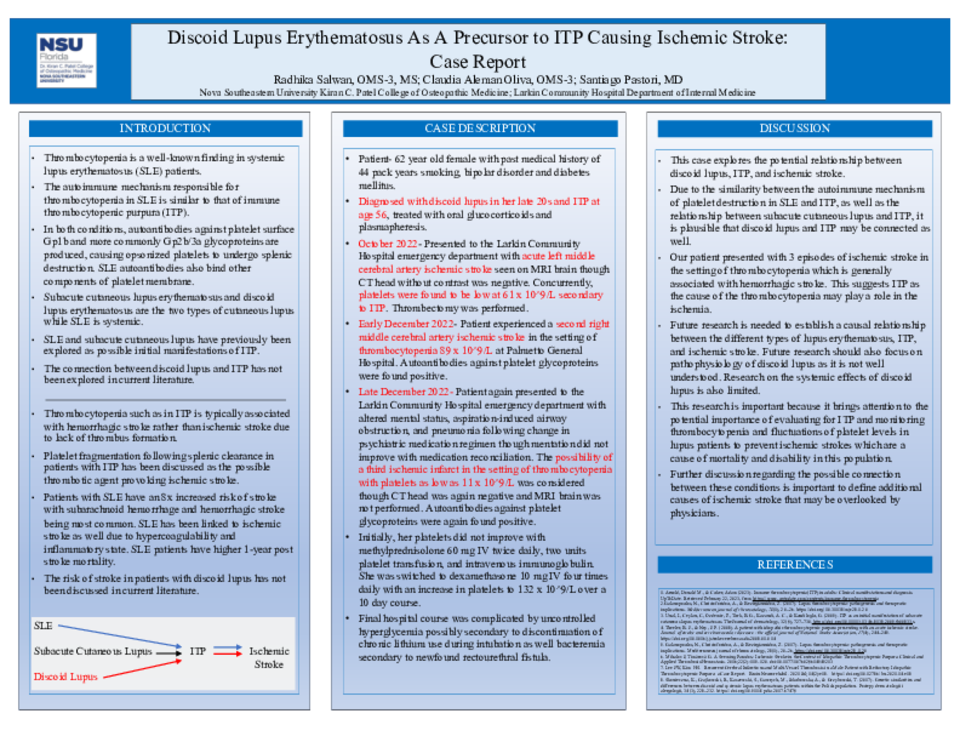 Discussion: This case explores the possible relationship between discoid lupus as a precursor to ITP which may be a precursor to ischemic stroke. The patient presented with rare ischemic strokes in the setting of thrombocytopenia which is more commonly associated with hemorrhagic stroke. Future research is needed to establish a causal relationship between the different types of lupus erythematosus, ITP, and ischemic stroke which would aid in developing diagnostic and treatment guidelines in lupus patients to prevent and manage ischemic stroke. Further discussion regarding the possible connection between these conditions is important to define additional causes of ischemic stroke that may be overlooked by physicians.