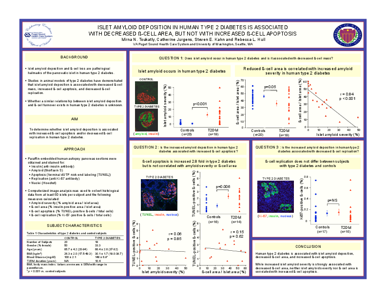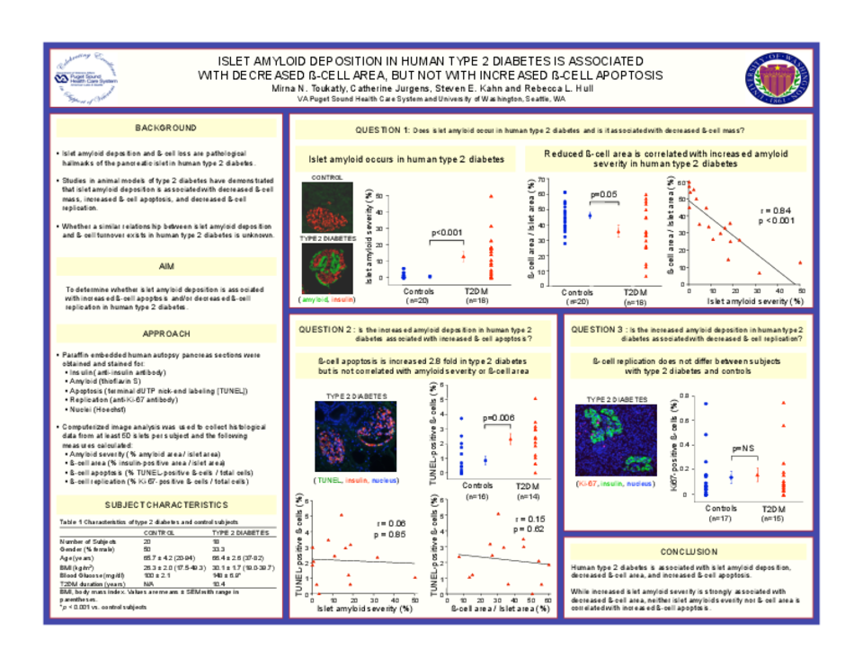 Conclusions: Human T2DM is associated with islet amyloid deposition, decreased β-cell area, and increased β-cell apoptosis. While islet amyloid is strongly associated with decreased β-cell area, neither islet amyloid deposition nor β-cell area is correlated with β-cell apoptosis.