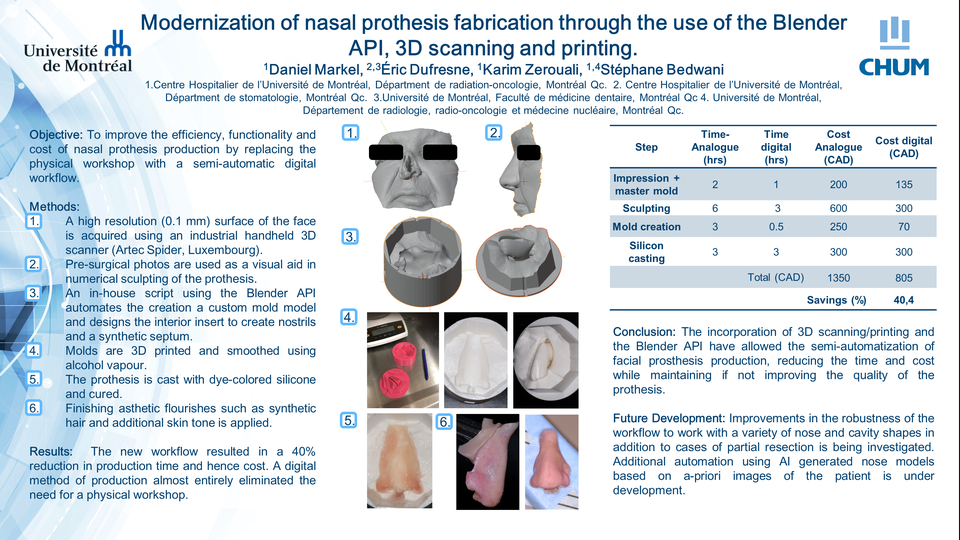 The new workflow is able to reduce the nasal prosthesis production time from a manually intensive 2 days to 6 hours excluding printing time. This time and material savings between the two processes translates to an approximate cost reduction of $545 per prosthetic or 40% of the conventional cost of production. As of this writing, 4 patients have had prostheses created from the new semi-automatic pipeline.