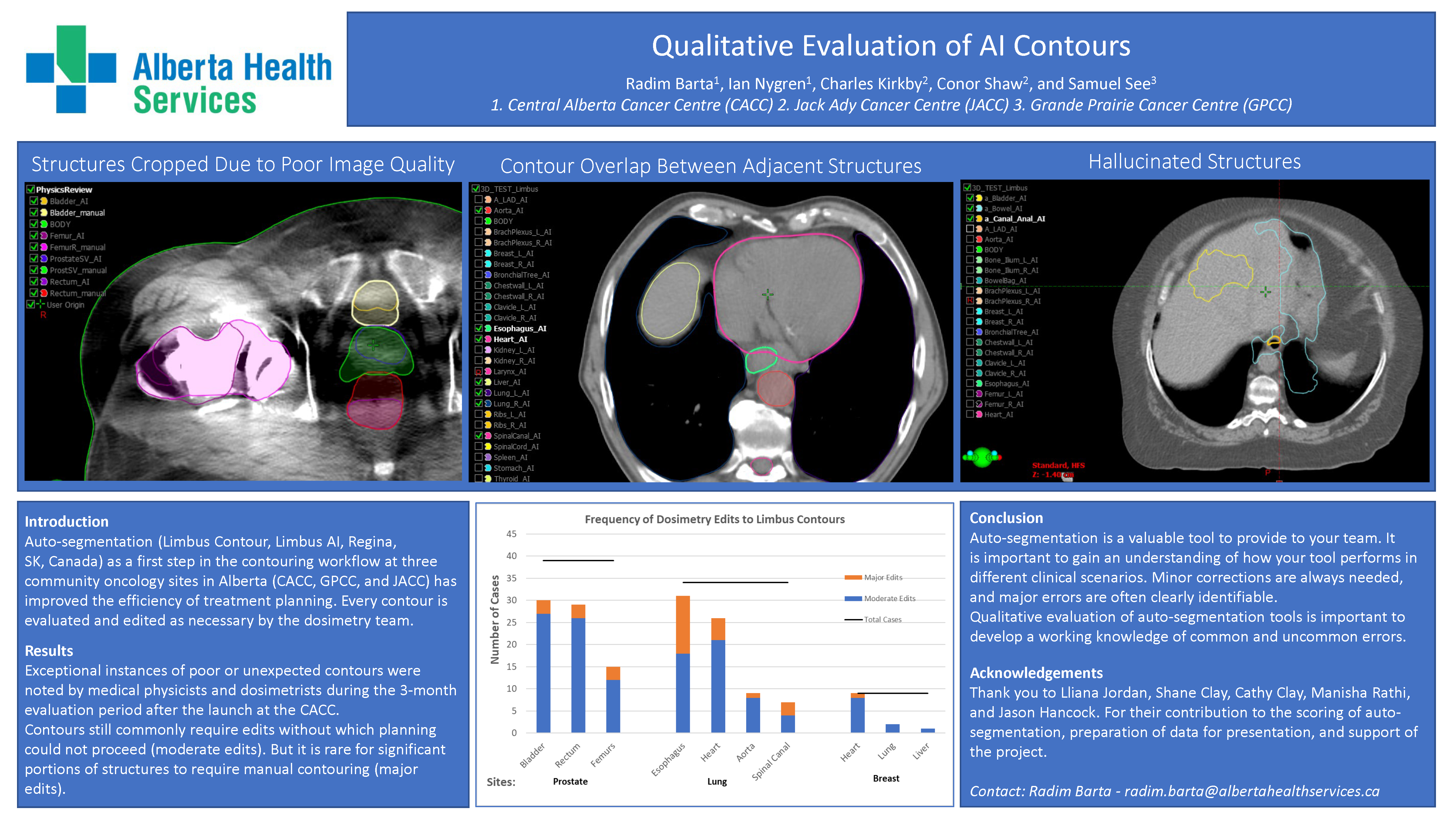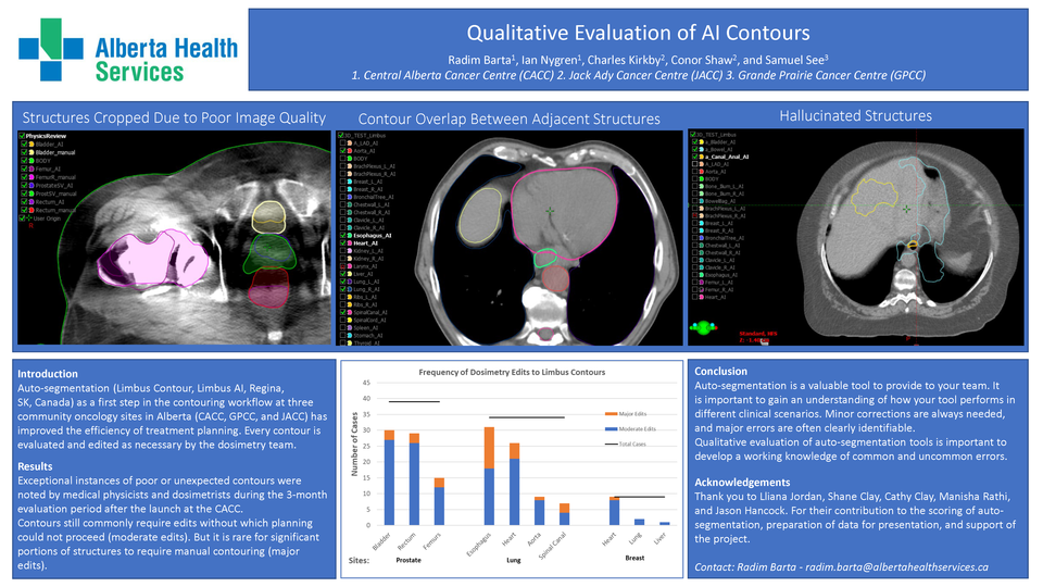 Patient CT scans imaged at three Alberta sites were contoured with Limbus Contour and independently by dosimetrists. For a minority of patients, the Limbus Contours were available to dosimetrists during the contouring step, allowing editing or re-contouring as deemed appropriate. The clinical contours were compared to the Limbus contour using Dice-coefficient (DC) and distance-to-agreement (DT) metrics. Further the contours were qualitatively reviewed to identify volumes of disagreement, and the potential for downstream clinical impact.