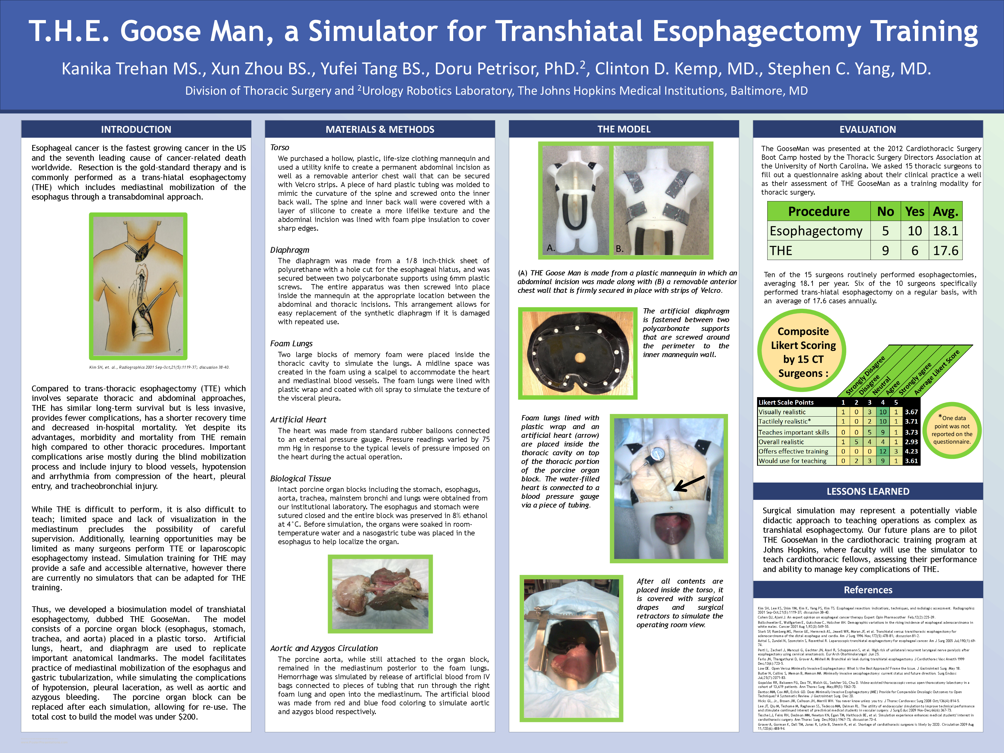 Esophageal cancer is the fastest growing cancer in the US and the seventh leading cause of cancer-related death worldwide. Resection is the gold-standard therapy and is commonly performed as a trans-hiatal esophagectomy (THE) which includes mediastinal mobilization of the esophagus through a transabdominal approach. While THE is difficult to perform, it is also difficult to teach; limited space and lack of visualization in the mediastinum precludes the possibility of careful supervision. Additionally, learning opportunities may be limited as many surgeons perform TTE or laparoscopic esophagectomy instead. Simulation training for THE may provide a safe and accessible alternative, however there are currently no simulators that can be adapted for THE training. Thus, we developed a biosimulation model of transhiatal esophagectomy, dubbed THE GooseMan. The model consists of a porcine organ block (esophagus, stomach, trachea, and aorta) placed in a plastic torso. Artificial lungs, heart, and diaphragm are used to replicate important anatomical landmarks. The model facilitates practice of mediastinal mobilization of the esophagus and gastric tubularization, while simulating the complications of hypotension, pleural laceration, as well as aortic and azygous bleeding. The porcine organ block can be replaced after each simulation, allowing for re-use, and the total cost to build the model was under $200.