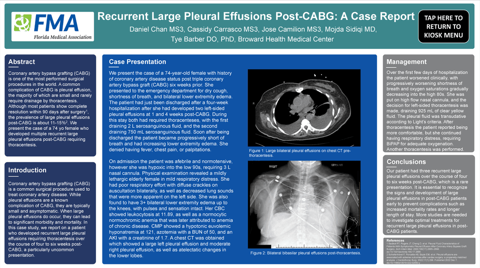 It is essential to recognize the signs and symptoms of large pleural effusions in post-CABG patients early on to prevent complications such as increased mortality rates, longer length of stay, and increased complication rates. More studies are necessary to investigate optimal treatments for recurrent large pleural effusions in post-CABG patients.