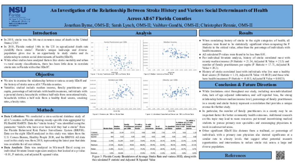 Methods: We conducted a cross-sectional database study of all 67 counties in Florida utilizing county-specific data aggregated by FLHealthCHARTS. Data for “stroke history” was identified using the parameter “Adults who have ever been told they had a stroke” from the Florida Behavioral Risk Factor Surveillance System (BRFSS). Data on the eight health categories analyzed in this study was taken from the U.S. Census Bureau, Healthy People 2030, and the BRFSS. All data used in this study was from 2019, representing the latest year that data was available for all our criteria. Data was retrieved from these sources and analyzed in Microsoft Excel using an individual bivariate linear regression analysis that looked at a p-value <0.01, F statistic, and adjusted R squared value. An analysis comparing each SDoH to stroke history was performed independently by two researchers and cross-referenced for accuracy.