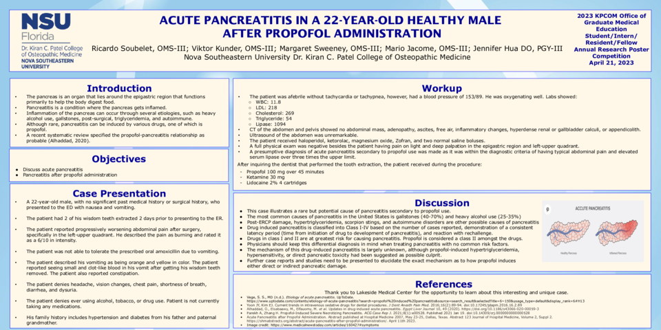 The pancreas is an organ that lies around the epigastric region that functions primarily to help the body digest food. Pancreatitis is a condition where the pancreas gets inflamed. Inflammation of the pancreas can occur through several etiologies, such as heavy alcohol use, gallstones, post-surgical, hypertriglyceridemia, and autoimmune. Although rare, pancreatitis can be induced by various drugs, one of which is propofol. Propofol is considered as being in class II of the drugs that cause acute pancreatitis. A recent systematic review specified the propofol-pancreatitis relationship as probable. A potential mechanism in which this happens may be from propofol's propensity to induce hypertriglyceridemia, a traditional etiology for acute pancreatitis.