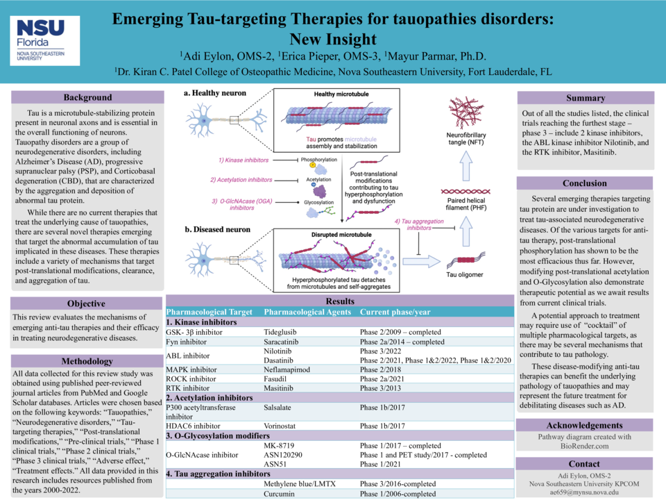 Background: Tau is a microtubule-stabilizing protein present in neuronal axons and is essential in the overall functioning of neurons. Tauopathy disorders, such as Alzheimer’s Disease (AD), progressive supranuclear palsy (PSP), and Corticobasal degeneration (CBD), are characterized by the accumulation and deposition of abnormal tau protein. Current therapies approved to treat these conditions have been limited to addressing symptoms instead of the underlying cause. New therapies targeting abnormal tau accumulation are currently emerging and include a variety of mechanisms that target post-translational modification, clearance, and aggregation of tau. It is important to explore these potential anti-tau therapies and their efficacy in the treatment of neurodegenerative tauopathies.