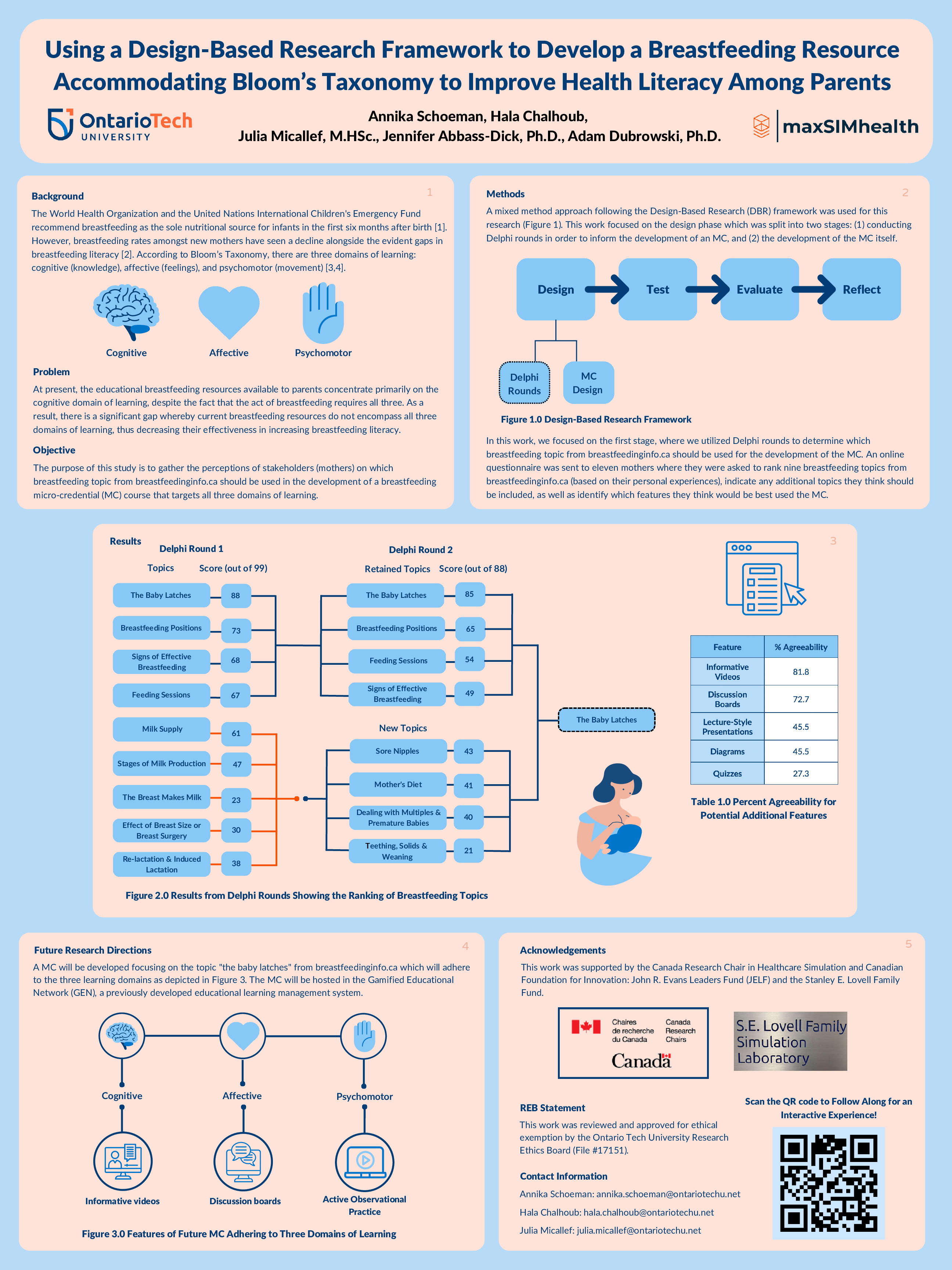 The World Health Organization and the United Nations International Children's Emergency Fund recommend breastfeeding as the sole nutritional source for infants in the first six months after birth. However, breastfeeding rates amongst new mothers have declined alongside the evident gaps in breastfeeding literacy. According to Bloom’s Taxonomy, there are three domains of learning: cognitive, affective, and psychomotor. Yet, the educational breastfeeding resources available to parents concentrate primarily on the cognitive and affective domains, although the act of breastfeeding requires all three. The purpose of this study is to gather the perceptions of stakeholders (mothers) to develop a breastfeeding micro-credential (MC) course that targets all three learning domains. This work will follow the Design-Based Research (DBR) framework which comprises four phases: design, test, evaluate, and reflect. This work focused on the design phase, which was split into two stages where the first stage utilized Delphi rounds to gather stakeholders' (i.e., mothers) perceptions regarding the agreeability of topics from a previously developed eHealth breastfeeding resource (breastfeedinginfo.ca) that should be included in the MC. The second stage will focus on the development of the MC itself. The first stage was completed through an online questionnaire sent to 11 mothers. Participants were asked to rank nine breastfeeding topics from the eHealth resource from most to least important for inclusion in the MC. A consensus was determined to be reached when the topics achieved a minimum of 65% agreeability. Qualitative data was gathered by means of open-ended questions in the Delphi rounds regarding additional topics they would want to be included in the MC, as well as what components of the MC would be most beneficial. A total of two Delphi rounds were performed, with one week to complete each round. Round one curated the four highest topics, along with their agreeability: the baby latches (89%), breastfeeding positions (74%), signs of effective breastfeeding (69%) and feeding sessions (68%), reaching over 65% agreeability to move on to Delphi round two. Based on stakeholders’ responses to the open-ended question in round one, four new topics were generated to be added to the questionnaire for round two. The new topics were: 1) dealing with multiple and premature babies, 2) sore nipples, 3) the effect of a mother's nutrition on breastfeeding, and 4) teething, solids, and weaning. In the second Delphi round, participants were asked to rank the top four topics curated from round one against the four new topics, resulting in a new top four, along with their agreeability: the baby latches (97%), breastfeeding positions (74%), feeding sessions (61%), signs of effective breastfeeding (56%). Lastly, participants were given a multiple-select question regarding what features they believed would be most beneficial to include in the MC. The top two features, along with their agreeability, were informative videos (82%) and discussion boards (73%). The results from this stage will inform the project's second stage, the development of a MC which adheres to Bloom's Taxonomy, which will focus on the topic: the baby latches.