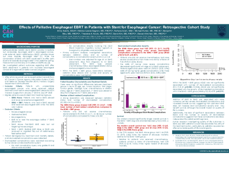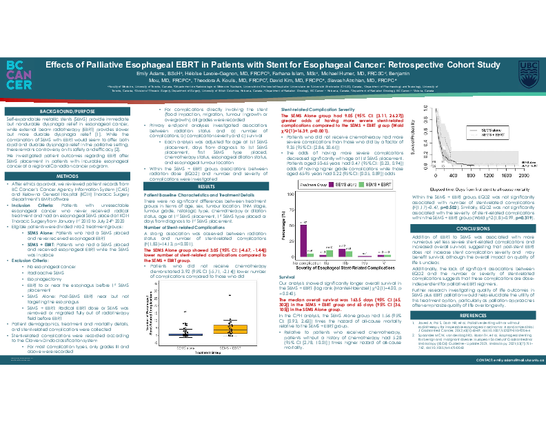 We conducted a single-centre retrospective chart review from January 2010 to July 2020 to compare stent-related complications and survival in patients with incurable esophageal cancer treated with SEMS alone or SEMS + EBRT at Kelowna General Hospital (KGH). KGH provides centralized thoracic surgery services for the entire Interior and Northern regions of British Columbia.