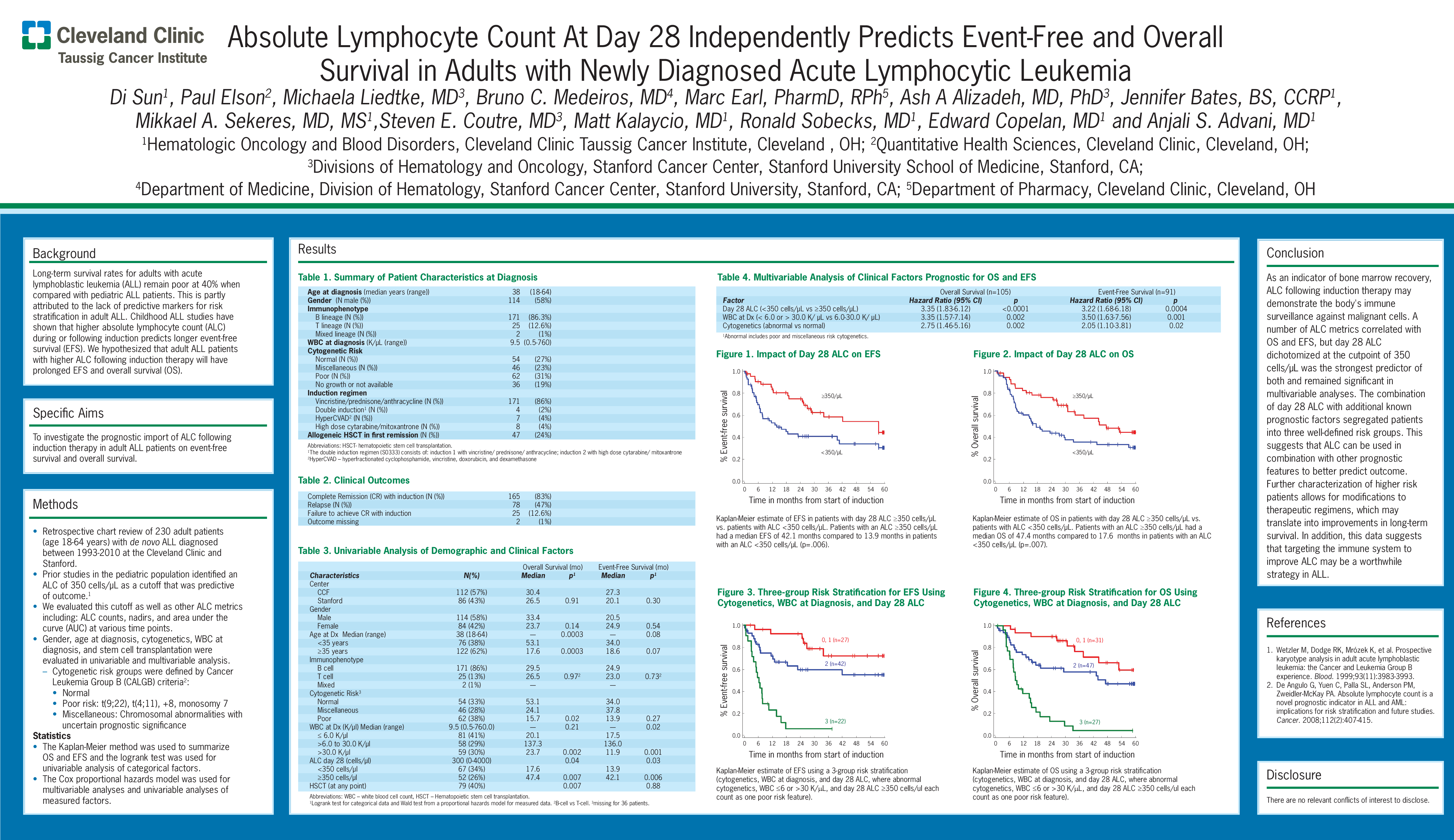 Methods: We conducted a retrospective chart review of 230 adult pts (age 18-64 yrs) with de novo ALL diagnosed between 1993-2010 at the Cleveland Clinic and Stanford, 198 of whom were evaluable (112 Cleveland Clinic, 86 Stanford). Prior studies in the pediatric population identified an ALC of 350 cells/μL as a cutoff that was predictive of outcome; we assessed this cutoff as well as other ALC metrics including day 1, 3, 7, 11, 14, 17, 20, 25, and 28 counts, nadirs and area under the curves at various time points, and the rate of ALC decline. We also evaluated the impact of gender, age at diagnosis, cytogenetics (CG), WBC at diagnosis, and transplant. The Kaplan-Meier method was used to summarize OS and EFS and the log-rank test was used for univariable analysis. The Cox proportional hazards model, stratified by institution, was used for multivariable and univariable analyses of measured factors.