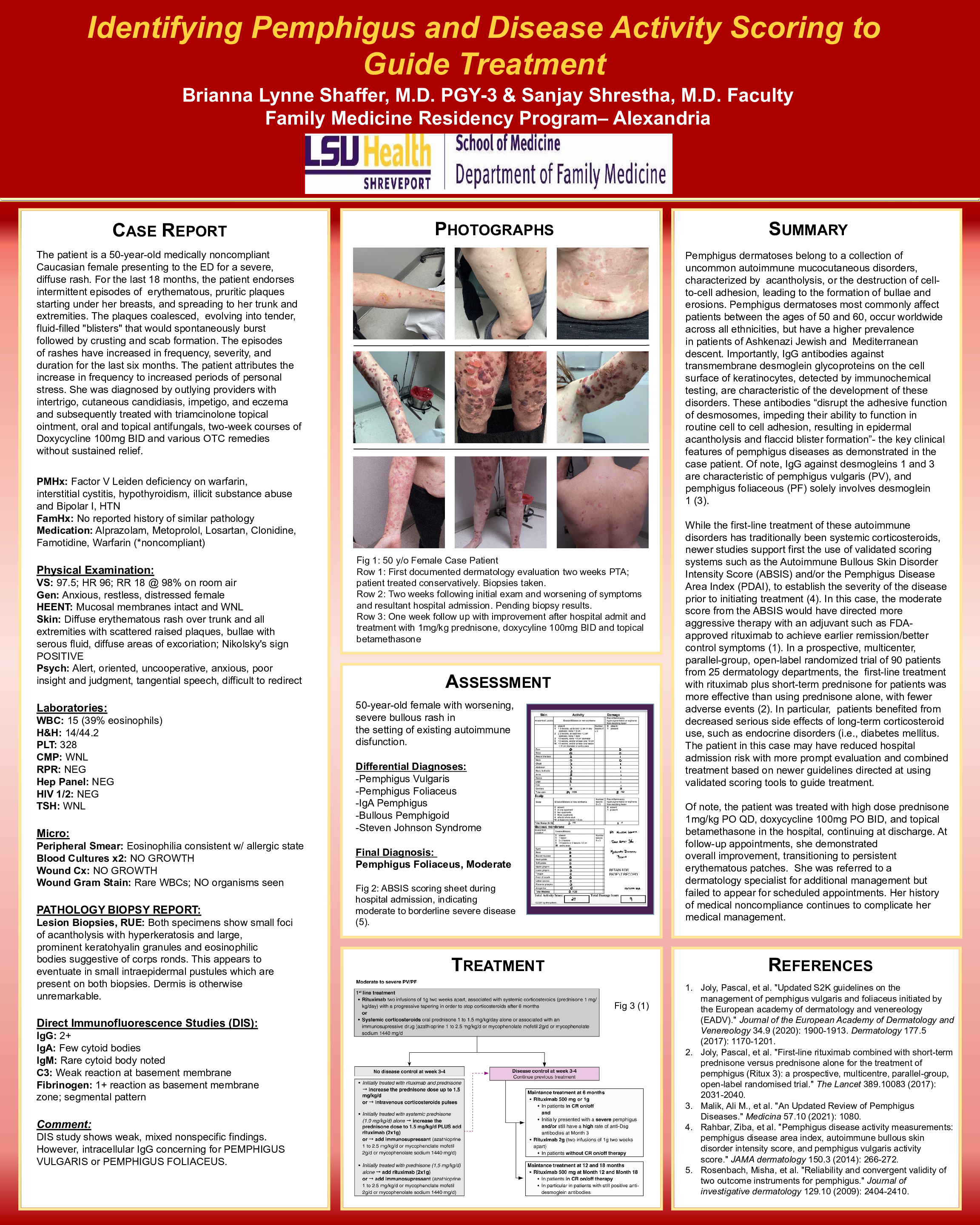 While the first-line treatment of these autoimmune disorders has traditionally been systemic corticosteroids, newer studies support first the use of validated scoring systems such as the Autoimmune Bullous Skin Disorder Intensity Score (ABSIS) and/or the Pemphigus Disease Area Index (PDAI), to establish the severity of the disease prior to initiating treatment. In this case, the moderate score from the ABSIS would have directed more aggressive therapy with an adjuvant such as FDA-approved rituximab to achieve earlier remission/better control symptoms. In a prospective, multicenter, parallel-group, open-label randomized trial of 90 patients from 25 dermatology departments, the first-line treatment with rituximab plus short-term prednisone for patients was more effective than using prednisone alone, with fewer adverse events. In particular, patients benefited from decreased serious side effects of long-term corticosteroid use, such as endocrine disorders (i.e., diabetes mellitus. The patient in this case may have reduced hospital admission risk with more prompt evaluation and combined treatment based on newer guidelines directed at using validated scoring tools to guide treatment.