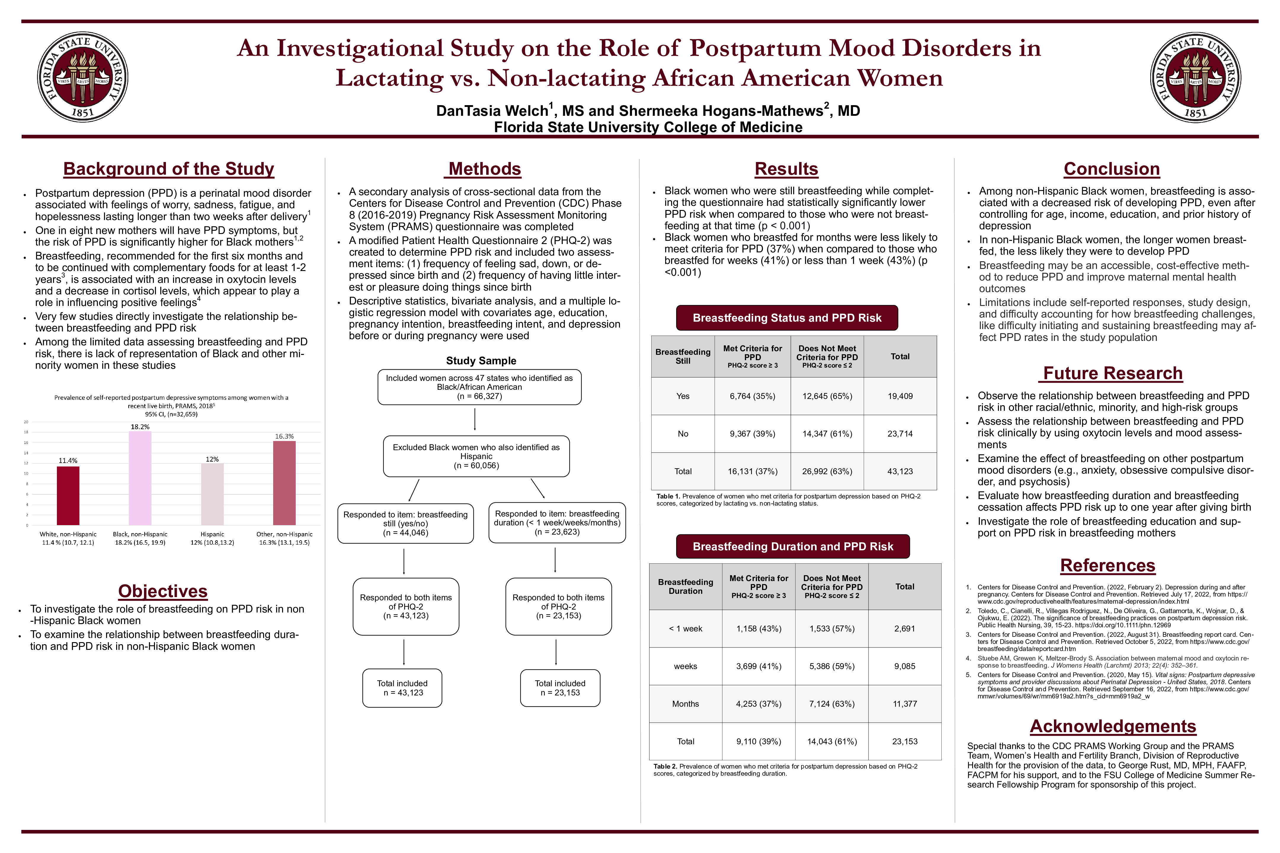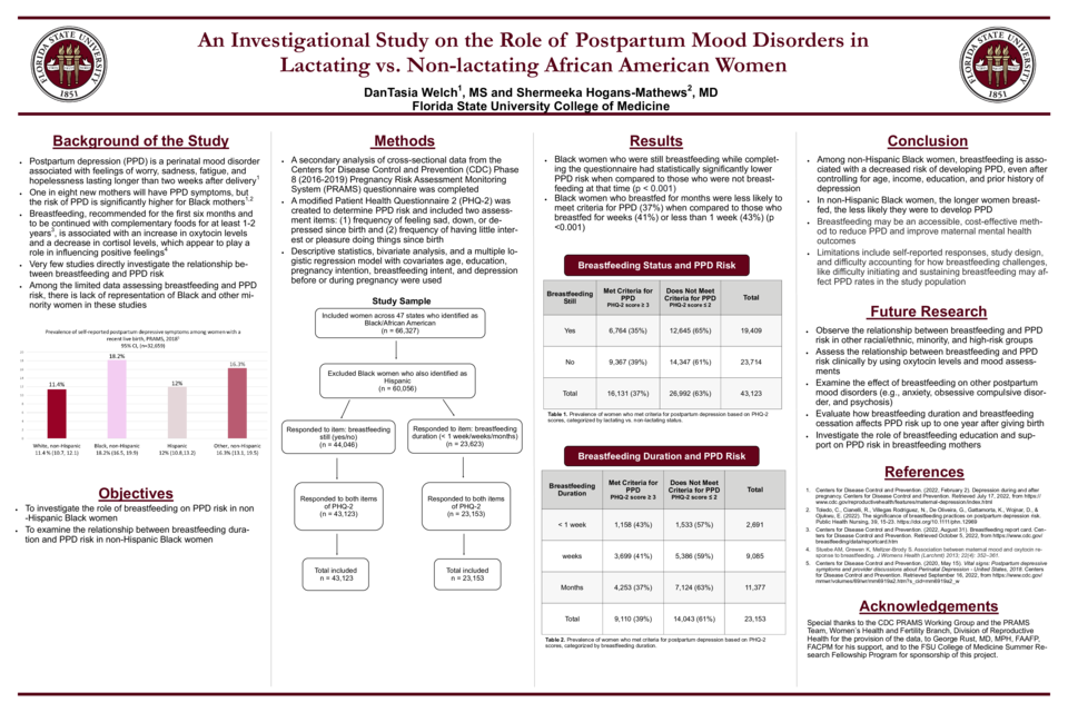 Methods: All mothers who completed the Phase 8 (2016-2019) Pregnancy Risk Assessment Monitoring System (PRAMS) questionnaire and identified as Black or African American were included in the study. Questions 35, 36, and 37 were used to assess breastfeeding status and duration. Questions 48, 49, and M5 were used to screen for PPD, which was the outcome variable of interest. Age, income, maternal education, and a prior history of depression were used as covariates. Statistical analysis was conducted using a logistic regression model in SPSS statistical software.