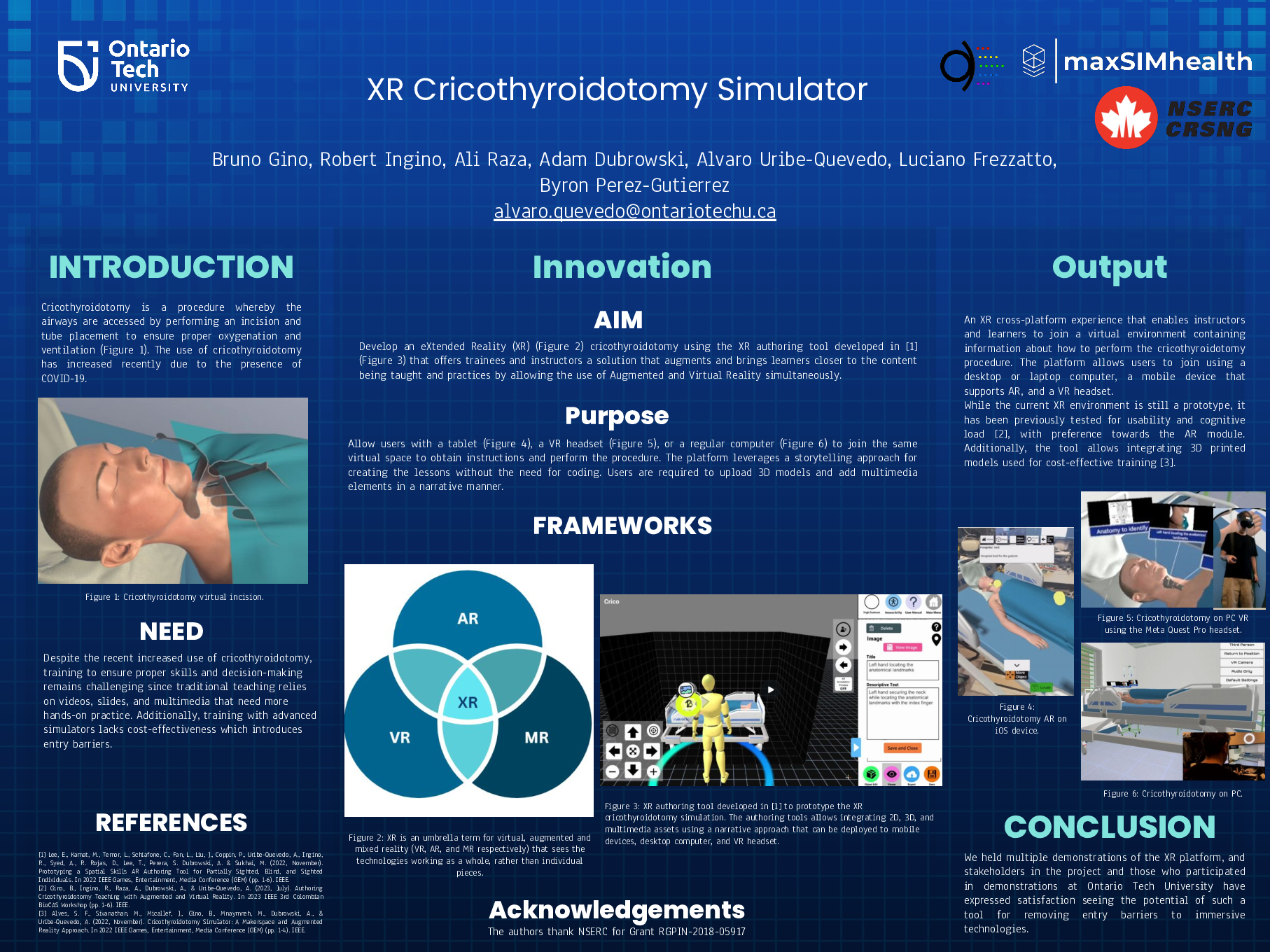 Results: An XR cross-platform that enables instructors and learners to join a virtual environment containing information about how to perform the cricothyroidotomy procedure. The platform allows users to join using a desktop or laptop computer, a mobile device that supports AR, and a VR headset. Users can collaborate, navigate, and discuss the procedures while also engaging in virtual hands-on manipulation of objects within the scene. We held multiple demonstrations of the XR platform, and stakeholders in the project and those who participated in demonstrations at Ontario Tech University have expressed satisfaction with the development of such a scenario.