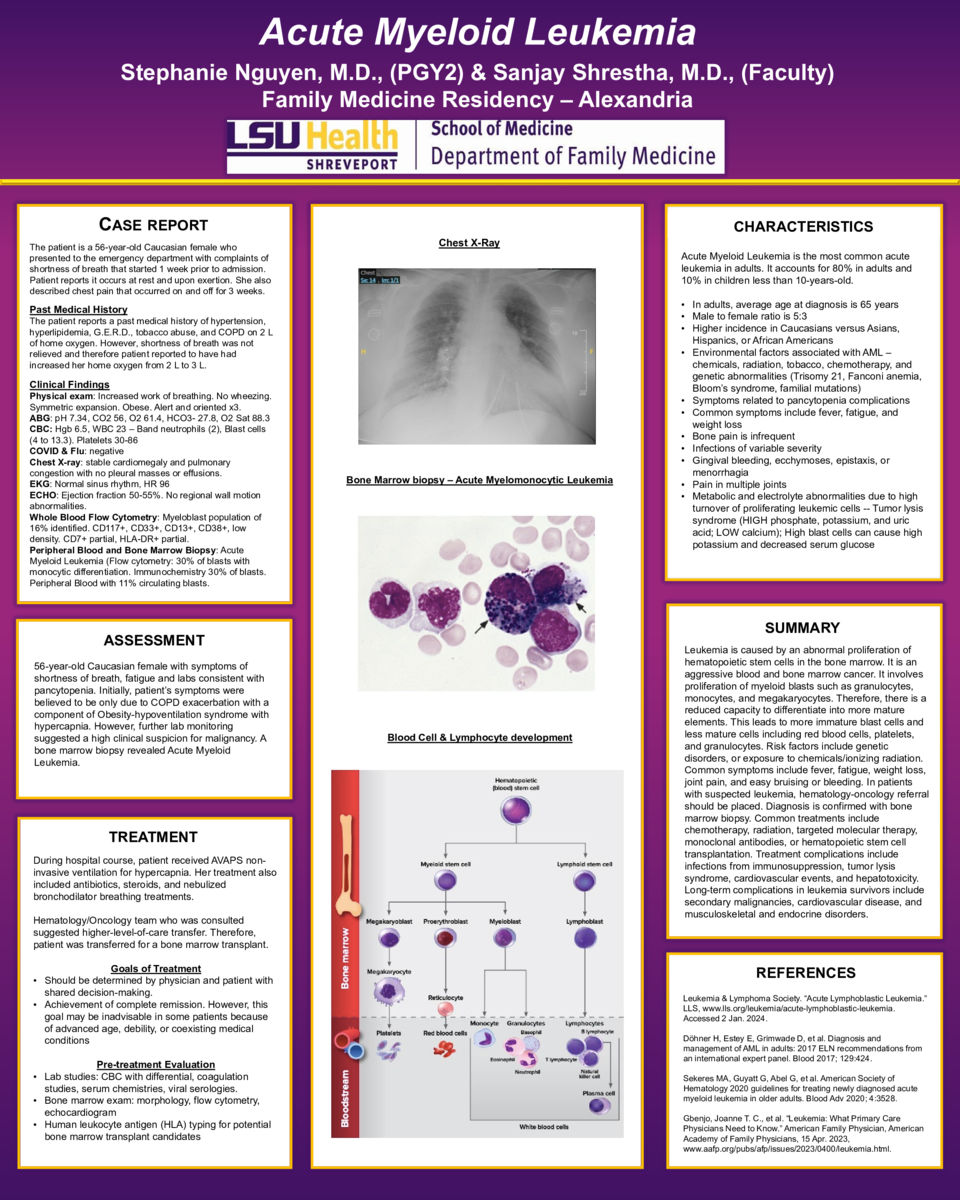 Leukemia is caused by an abnormal proliferation of hematopoietic stem cells in the bone marrow. It is an aggressive blood and bone marrow cancer. It involves the proliferation of myeloid blasts such as granulocytes, monocytes, and megakaryocytes. Therefore, there is a reduced capacity to differentiate into more mature elements. This leads to more immature blast cells and less mature cells, including red blood cells, platelets, and granulocytes. Risk factors include genetic disorders or exposure to chemicals/ionizing radiation. Common symptoms include fever, fatigue, weight loss, joint pain, and easy bruising or bleeding. In patients with suspected leukemia, a hematology-oncology referral should be placed. Diagnosis is confirmed with a bone marrow biopsy. Common treatments include chemotherapy, radiation, targeted molecular therapy, monoclonal antibodies, or hematopoietic stem cell transplantation. Treatment complications include infections from immunosuppression, tumor lysis syndrome, cardiovascular events, and hepatotoxicity. Long-term complications in leukemia survivors include secondary malignancies, cardiovascular disease, and musculoskeletal and endocrine disorders.
