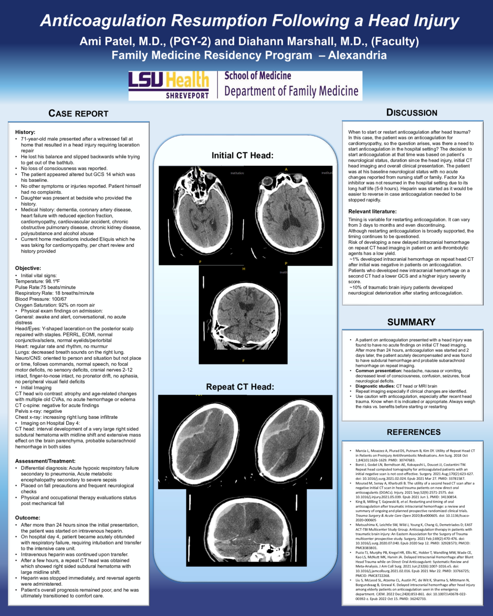 When to start or restart anticoagulation after head trauma? In this case, the patient was on anticoagulation for cardiomyopathy, so the question arises, was there a need to start anticoagulation in the hospital setting? The decision to start anticoagulation at that time was based on the patient’s neurological status, duration since the head injury, initial CT head imaging, and overall clinical presentation. The patient was at his baseline neurological status with no acute changes reported from nursing staff or family. Factor Xa inhibitor was not resumed in the hospital setting due to its long half-life (5-9 hours). Heparin was started as it would be easier to reverse in case anticoagulation needed to be stopped rapidly.