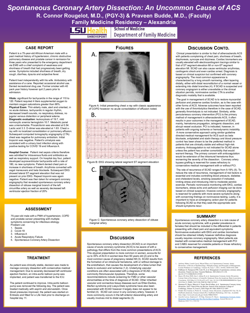Spontaneous coronary artery dissection is a rare cause of acute coronary syndrome, with a greater prevalence in females that should be included in the differential in patients presenting with chest pain and equivalent symptoms. Noninvasive electrocardiogram and cardiac biomarkers evaluation should be obtained initially; however, a definitive diagnosis usually requires coronary angiography. Most patients are treated with conservative medical management, with percutaneous intervention and coronary artery bypass grafting reserved for unstable patients or those refractory to conservative management.