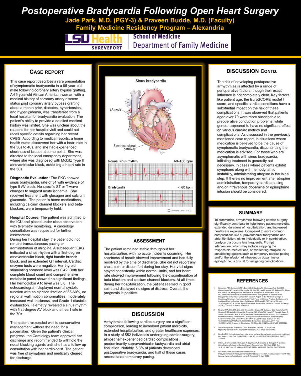Arrhythmias following cardiac surgery significantly contribute to heightened patient morbidity, extended durations of hospitalization, and increased healthcare expenses. Compared to more common complications like supraventricular tachycardia and atrial fibrillation, either individually or in combination, bradycardia occurs less frequently. Prompt intervention, which may include stopping the responsible medications, administering atropine, or considering options such as temporary cardiac pacing and/or the infusion of intravenous dopamine or epinephrine, is crucial for mitigating complications.