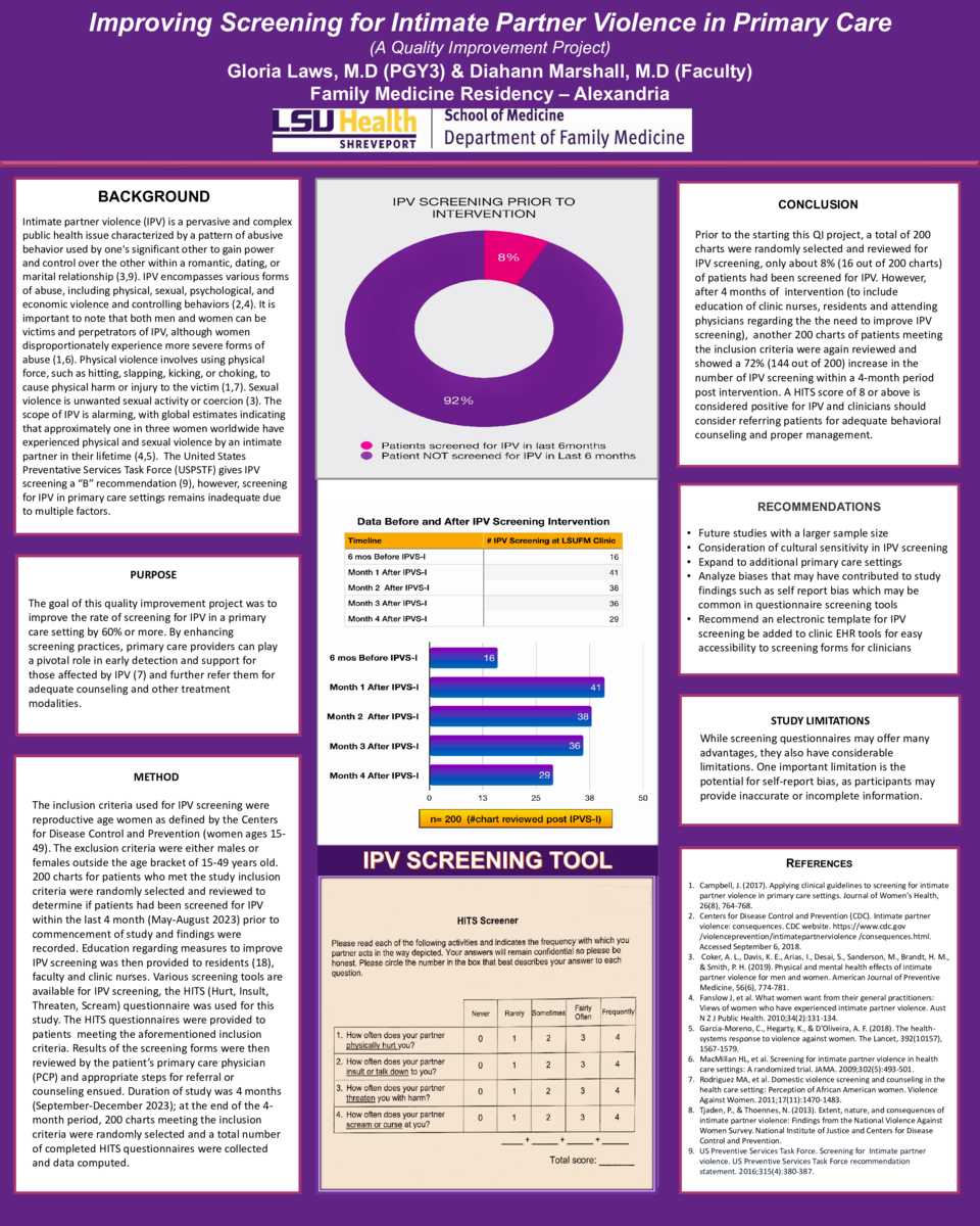 Prior to the starting of this QI project, a total of 200 charts were randomly selected and reviewed for intimate partner violence (IPV) screening; only about 8% (16 out of 200 charts) of patients had been screened for IPV. However, after 4 months of intervention (including education of clinic nurses, residents, and attending physicians regarding the need to improve IPV screening), another 200 charts of patients meeting the inclusion criteria were again reviewed and showed a 72% (144 out of 200) increase in the number of IPV screening within a 4-month period post-intervention. A HITS score of 8 or above is considered positive for IPV, and clinicians should consider referring patients for adequate behavioral counseling and proper management.