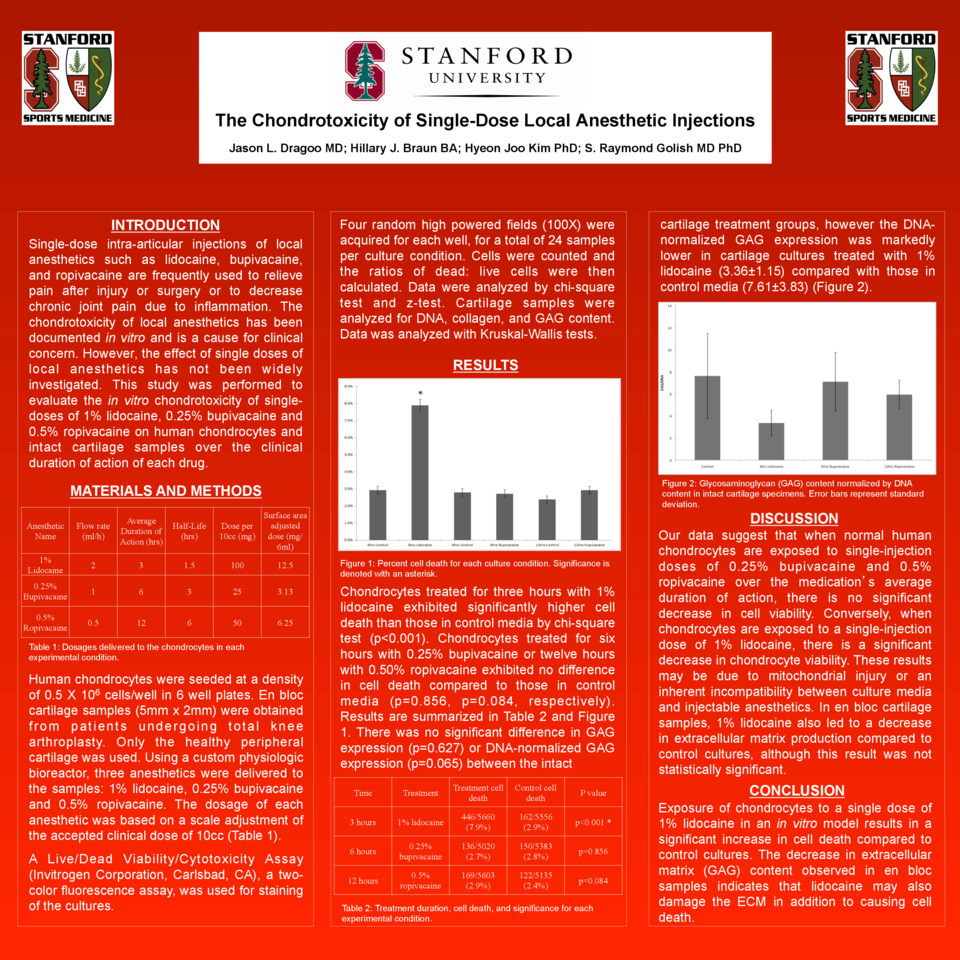 Results: Chondrocytes treated for three hours with a single dose of 1% lidocaine exhibited significantly more cell death (7.9%) compared to control media (2.9%; p<0.001). No significant difference in cell death was observed in chondrocytes treated for six hours with 0.25% bupivacaine (2.7%) versus controls (2.8%; p=0.856) or cells treated for 12 hours in 0.5% ropivacaine (2.9%) versus controls (2.4%; p=0.084). There was no significant difference in GAG expression (p=0.627) or DNA-normalized GAG expression (p=0.065) between the intact cartilage treatment groups, however the DNA-normalized GAG expression was markedly lower in cartilage cultures treated with 1% lidocaine (3.36±1.15) compared with those in control media (7.61±3.83).
