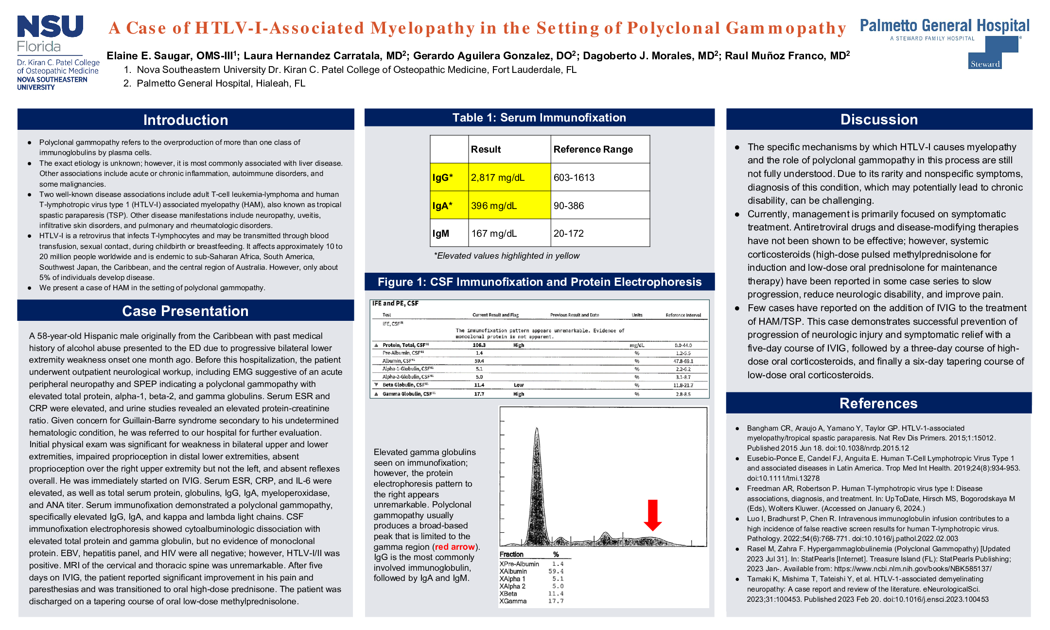 Case Description: A 58-year-old Hispanic male originally from the Caribbean with past medical history of alcohol abuse presented to the ED due to progressive bilateral lower extremity weakness onset one month ago. Three weeks earlier, the patient had been admitted to another hospital for workup; however, no definitive diagnosis was determined. After discharge, he followed up outpatient with a neurologist. EMG was suggestive of an acute peripheral neuropathy. SPEP indicated a polyclonal gammopathy with elevated total protein, alpha-1, beta-2, and gamma globulins. ESR and CRP were elevated, and urine studies revealed an elevated protein-creatinine ratio. Given concern for Guillain-Barre syndrome secondary to his undetermined hematologic condition, he was referred to our hospital for further evaluation. Initial physical exam was significant for weakness in bilateral upper and lower extremities, impaired proprioception in distal lower extremities, absent proprioception over the right upper extremity but not the left, and absent reflexes overall. He was immediately started on IVIG. Inflammatory markers (ESR, CRP, IL-6) were elevated, as well as total serum protein, globulins, IgG, IgA, myeloperoxidase, and ANA titer. Serum immunofixation demonstrated a polyclonal gammopathy, specifically elevated IgG, IgA, and kappa and lambda light chains. Lumbar puncture was performed and CSF analysis only demonstrated elevated herpes I/II IgG and West Nile virus IgG, suggesting previous infection. CSF immunofixation electrophoresis showed cytoalbuminologic dissociation with elevated total protein and gamma globulin, but no evidence of monoclonal protein. EBV, hepatitis panel, and HIV were all negative, but HTLV-I/II was positive. MRI of the cervical and thoracic spine was unremarkable. After five days on IVIG, the patient reported significant improvement in his pain and paresthesias and was transitioned to oral high-dose prednisone. The patient was discharged on a tapering course of oral low-dose methylprednisolone and advised to follow up with neurology, hematology, and his primary care physician.