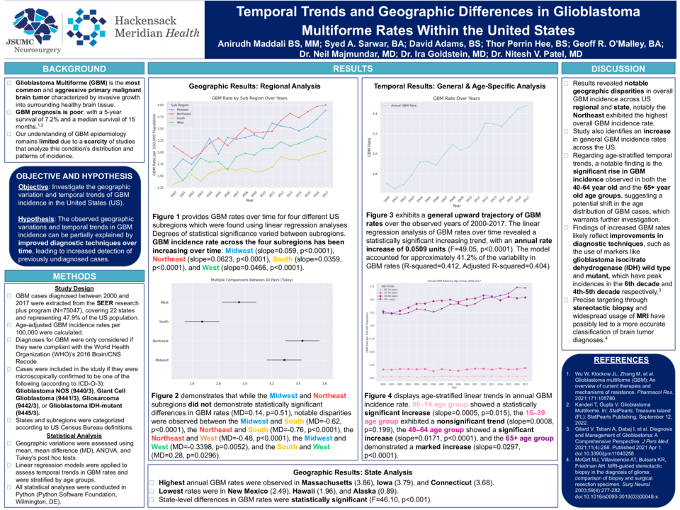 Results: The annual GBM rate for each subregion is: Northeast=3.43, Midwest=3.29, West=2.95, and South=2.68. The differences between regions were statistically significant (F=24.04, P<0.00001). Statistically significant disparities were observed in all pairwise combinations between the four regions except between the Midwest and Northeast. The highest annual GBM rates were observed in Massachusetts (3.86), Iowa (3.79), and Connecticut (3.68), while the lowest rates were in New Mexico (2.49), Hawaii (1.96), and Alaska (0.89). These state-level differences in GBM rates were statistically significant (F=46.10, p<0.001). The annual GBM incidence rate across the US has been increasing over time (F=49.05, p<0.0001, slope=0.051). Similar trends were observed across subregions: Midwest (slope=0.059, p<0.0001), Northeast (slope=0.0623, p<0.0001), South (slope=0.0359, p<0.0001), and West (slope=0.0466, p<0.0001).