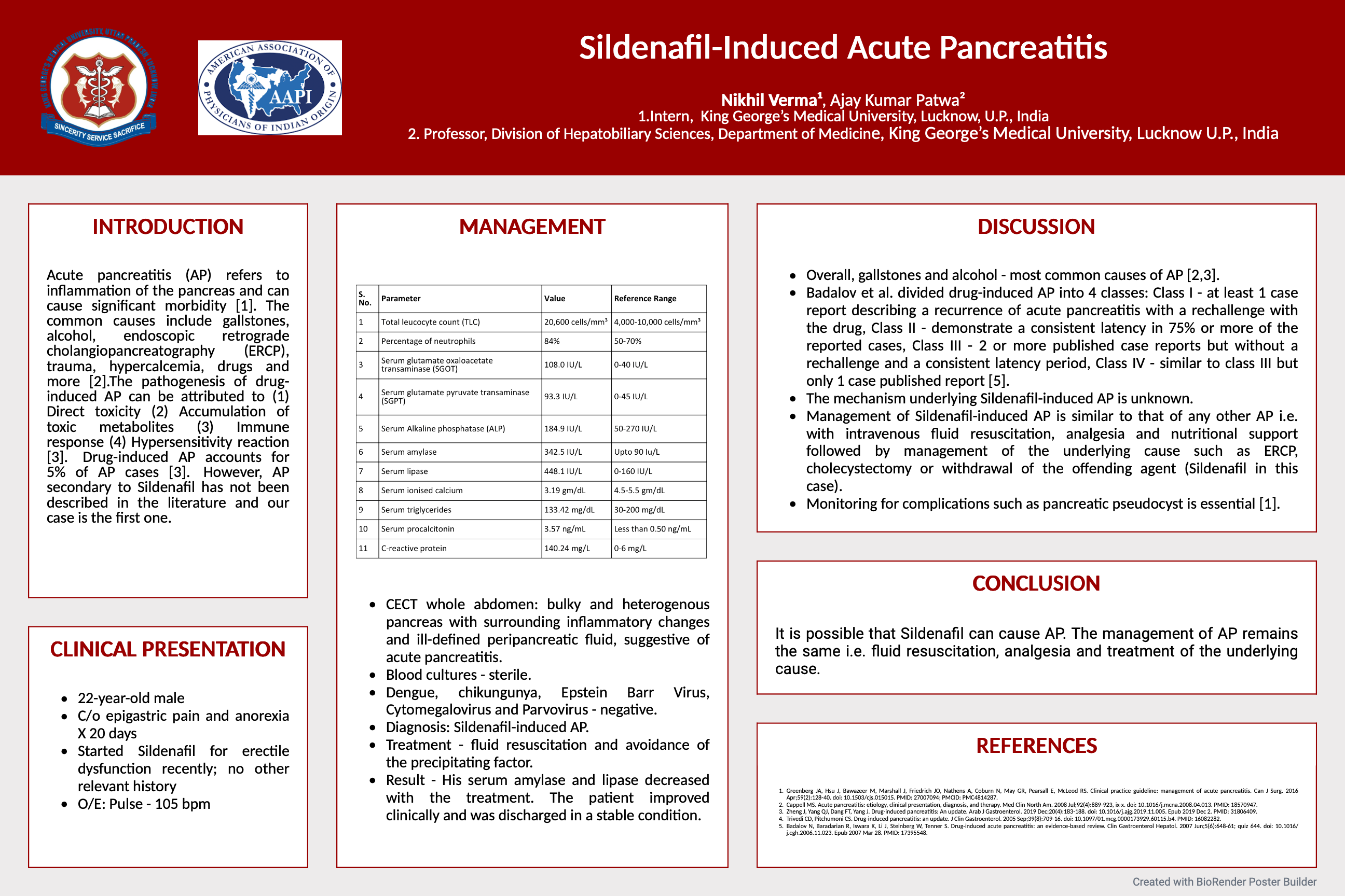 A 22-year-old male presented with epigastric pain and anorexia for 20 days. There was no history of insect bites, trauma, procedure, chronic illness, and alcoholism. He reported starting Sildenafil. TLC was 20,600 cells/mm3 with 84% neutrophils. SGOT, SGPT and ALP were 108.0 IU/L, 93.3 IU/L, and 184.9 IU/L respectively. Serum amylase was 342.5 IU/L and serum lipase was 448.1 IU/L. Serum ionised calcium, triglycerides, procalcitonin and CRP were 3.19 gm/dL, 133.42 mg/dL, 3.57 ng/mL and 140.24 mg/L respectively. CECT was suggestive of AP. Blood cultures were sterile. Given the history and CECT finding, he was diagnosed with Sildenafil-induced AP and was managed with fluid resuscitation and withdrawal of the precipitating factor. Serum amylase and lipase decreased with the treatment and he improved clinically.