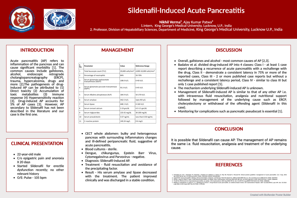 Acute pancreatitis (AP) refers to inflammation of the pancreas and can be caused by gallstones, alcohol, ERCP, trauma, hypercalcemia, drugs, etc [1, 2]. However, AP secondary to Sildenafil has not been described previously.