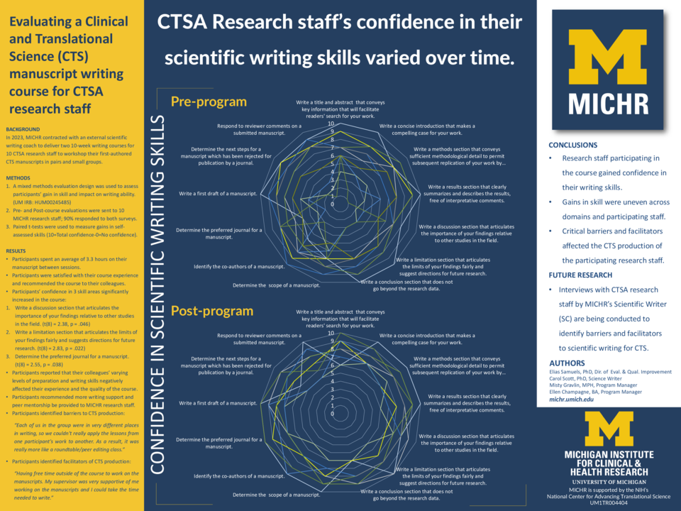 Lay Summary: Professional development can be used to improve the writing skills and productivity of Clinical and Translational Research staff. A 10-week course for Clinical and Translational Research staff working at Michigan Medicine helped 9 participating staff work on manuscripts and papers about topics relevant to Clinical and Translational Science. The results of evaluations of this course indicate that the professional development was effective, but also that the course needs to be redesigned in order to better support the working conditions and capabilities of busy research staff. Preliminary results indicate that ongoing writing mentoring and protected time to work on manuscript writing may be critical supports needed by Clinical and Translational Research staff to support their writing of Clinical and Translational Science.