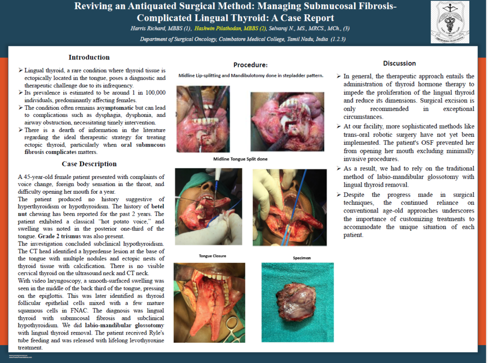Case: A 45-year-old female patient presented with complaints of voice change, foreign body sensation in the throat, and difficulty opening her mouth for a year. The patient produced no history suggestive of hyperthyroidism or hypothyroidism. The history of betel nut chewing has been reported for the past 2 years. The patient exhibited a classical “hot potato voice,” and swelling was noted in the posterior one-third of the tongue. Grade 2 trismus was also present. The investigation concluded subclinical hypothyroidism. The CT head identified a hyperdense lesion at the base of the tongue with multiple nodules and ectopic nests of thyroid tissue with calcification. There is no visible cervical thyroid on the ultrasound neck or CT neck. With video laryngoscopy, a smooth-surfaced swelling was seen in the middle of the back third of the tongue, pressing on the epiglottis. This was later identified as thyroid follicular epithelial cells mixed with a few mature squamous cells in FNAC. The diagnosis was lingual thyroid with submucosal fibrosis and subclinical hypothyroidism. We did labiomandibular glossotomy and lingual thyroid removal. The patient received Ryle's tube feeding and was released with lifelong levothyroxine treatment.