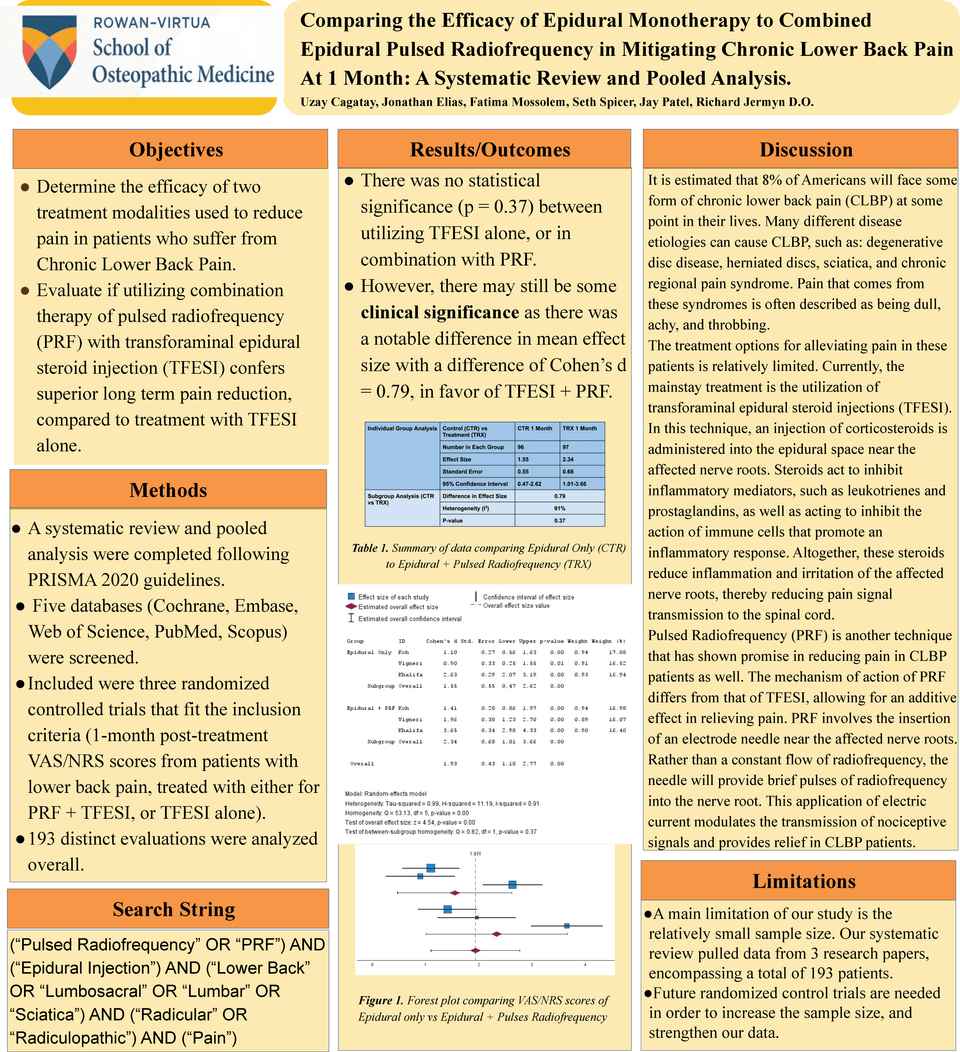 Authors: Uzay Cagatay1 , Jonathan Elias1 , Fatima Mossolem MS1,2 , Jay Patel1 , Seth Spicer MS1,2 , Richard Jermyn DO1 1Rowan-Virtua School of Osteopathic Medicine, Stratford, NJ 2 Futures Forward Research Institute, Toms River, NJ