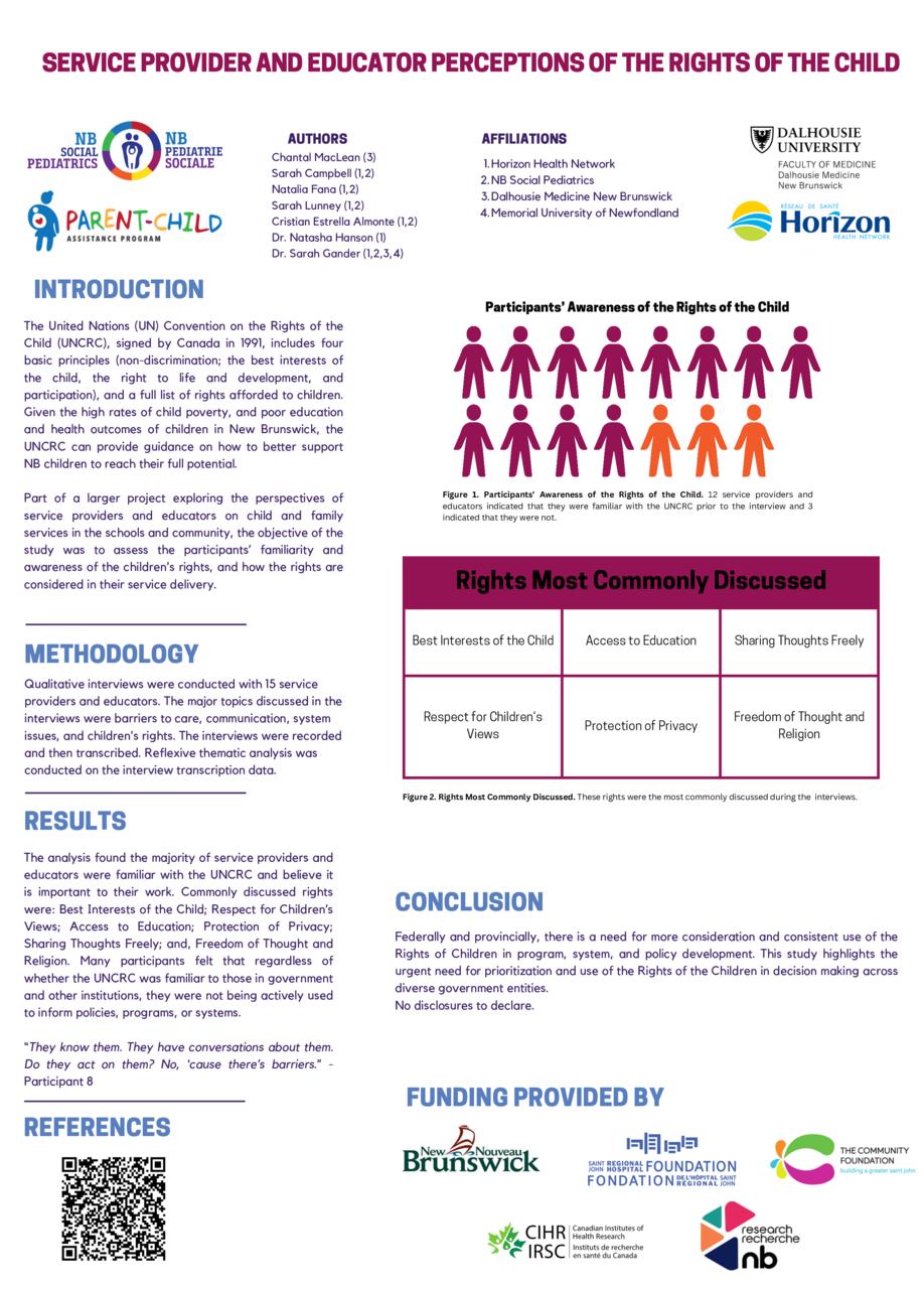 The United Nations (UN) Convention on the Rights of the Child (UNCRC), signed by Canada in 1991, includes four basic principles (non-discrimination; the best interests of the child, the right to life and development, and participation), and a full list of rights afforded to children. Given the high rates of child poverty, and poor education and health outcomes of children in New Brunswick, the UNCRC can provide guidance on how to better support NB children to reach their full potential. Part of a larger project exploring the perspectives of service providers and educators on child and family services in the schools and community, the objective of the study was to assess the participants’ familiarity and awareness of the children’s rights, and how the rights are considered in their service delivery.