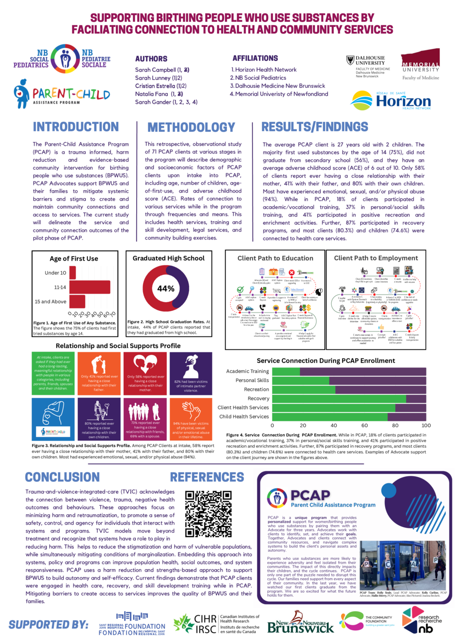 The Parent-Child Assistance Program (PCAP) is a trauma informed, harm reduction and evidence-based community intervention for birthing people who use substances (BPWUS). PCAP Advocates support BPWUS and their families to mitigate systemic barriers and stigma to create and maintain community connections and access to services. The current study will delineate the service and community connection outcomes of the pilot phase of PCAP.