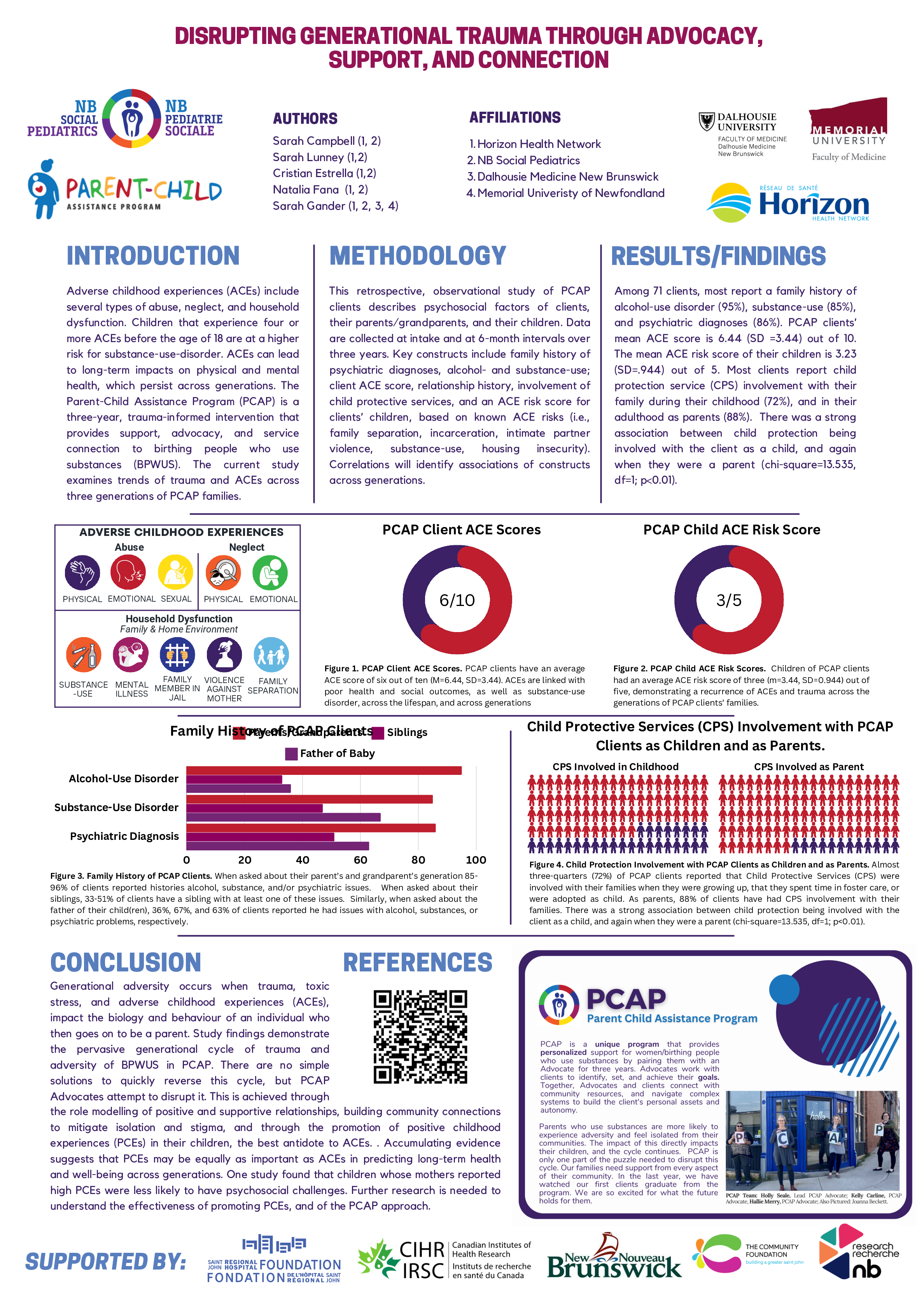 Among 71 clients, most report a family history of alcohol-use disorder (95%), substance-use (85%), and psychiatric diagnoses (86%). PCAP clients’ mean ACE score is 6.44 (SD =3.44) out of 10. The mean ACE risk score of their children is 3.23 (SD= .944) out of 5. Most clients report child protection service (CPS) involvement with their family during their childhood (72%), and in their adulthood as parents (88%). There was a strong association between child protection being involved with the client as a child, and again when they were a parent (chi-square=13.535, df=1; p<0.01).