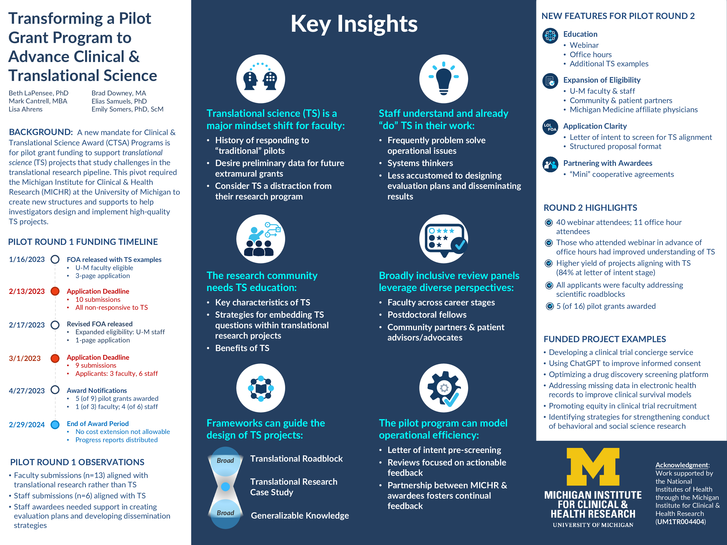 METHODS/STUDY POPULATION: The Michigan Institute for Clinical & Health Research (MICHR) at the University of Michigan (U-M) has launched two rounds of pilot funding since March 2023. Faculty and staff across U-M’s three campuses, community members, and those at collaborating institutions and hospitals were eligible to apply. New pre-award supports included a CTS project framework; a recorded webinar that educated about CTS and the funding opportunity; office hours to provide tailored project feedback; a letter of intent to screen for alignment with CTS; and reviewer training for academic and community reviewers. Funded projects operate like 'mini cooperative agreements”, with MICHR experts partnering with awardees to refine evaluation plans, prepare work products, advise on dissemination, and navigate emergent challenges.