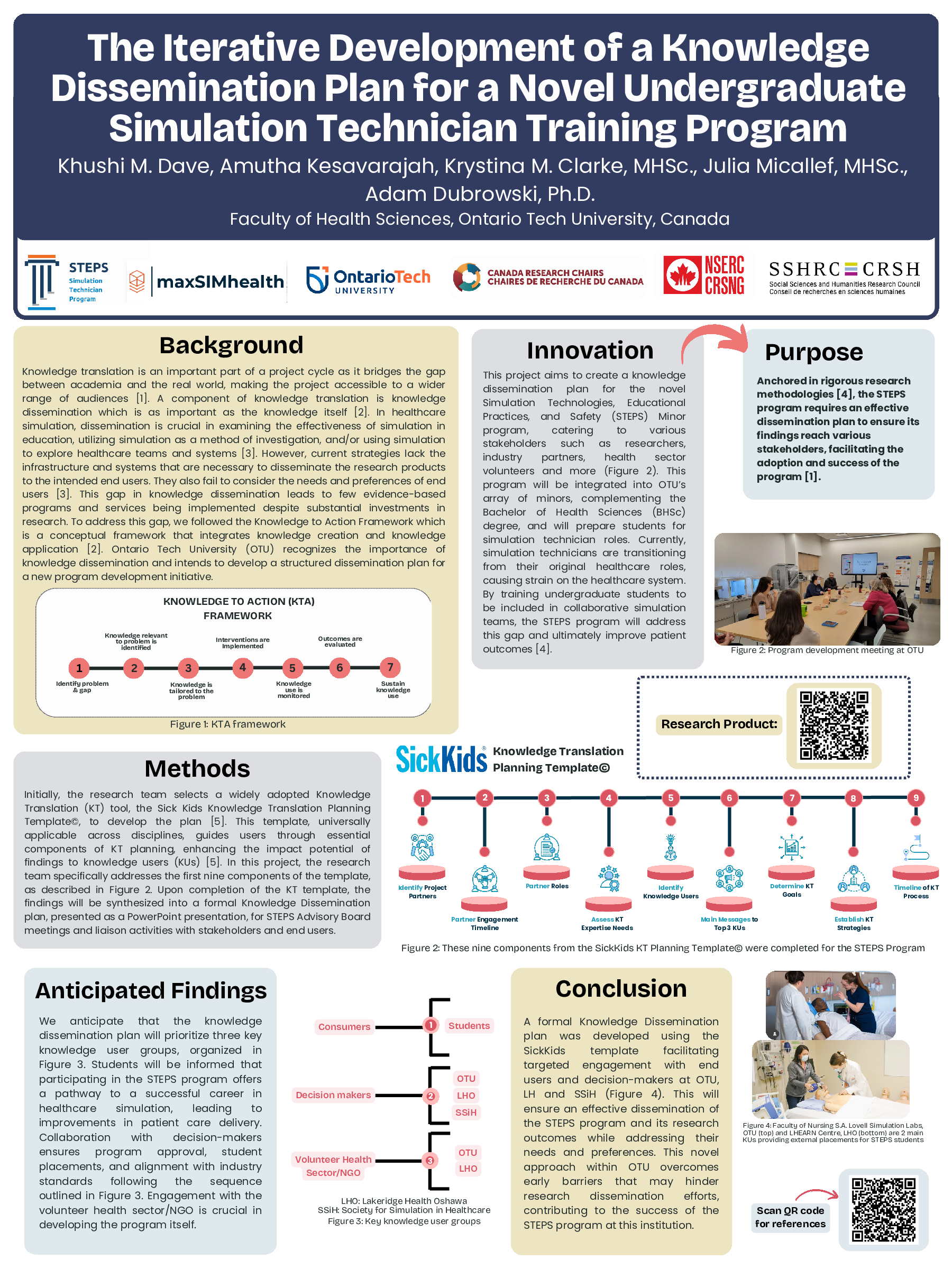 Knowledge translation is an important part of a project cycle as it bridges the gap between academia and the real world, making the project accessible to a wider range of audiences [1]. A component of knowledge translation is knowledge dissemination which is as important as the knowledge itself [2]. In healthcare simulation, dissemination is crucial in examining the effectiveness of simulation in education, utilizing simulation as a method of investigation, and/or using simulation to explore healthcare teams and systems [3]. However, current strategies lack the infrastructure and systems that are necessary to disseminate the research products to the intended end users. They also fail to consider the needs and preferences of end users [3]. This gap in knowledge dissemination leads to few evidence-based programs and services being implemented despite substantial investments in research. To address this gap, we followed the Knowledge to Action Framework which is a conceptual framework that integrates knowledge creation and knowledge application [2]. Ontario Tech University (OTU) recognizes the importance of knowledge dissemination and intends to develop a structured dissemination plan for a new program development initiative.